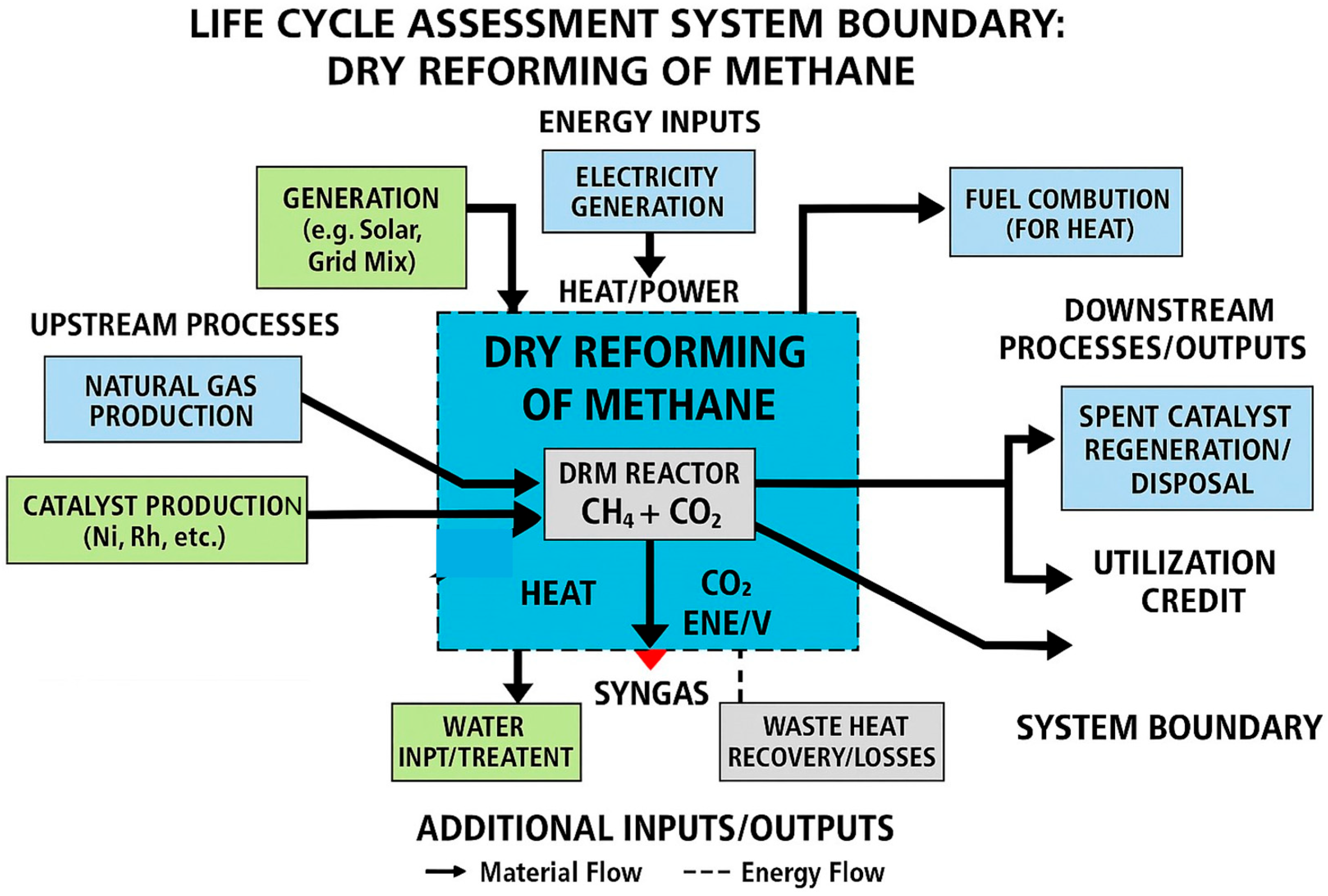 CO2-source accounting: Distinguishing between flue gas recycling (zero upstream burden) and captured CO2 (≈3 MJ kg−1 CO2 capture energy penalty) is essential for comparing DRM with CCS- or DAC-coupled systems.
