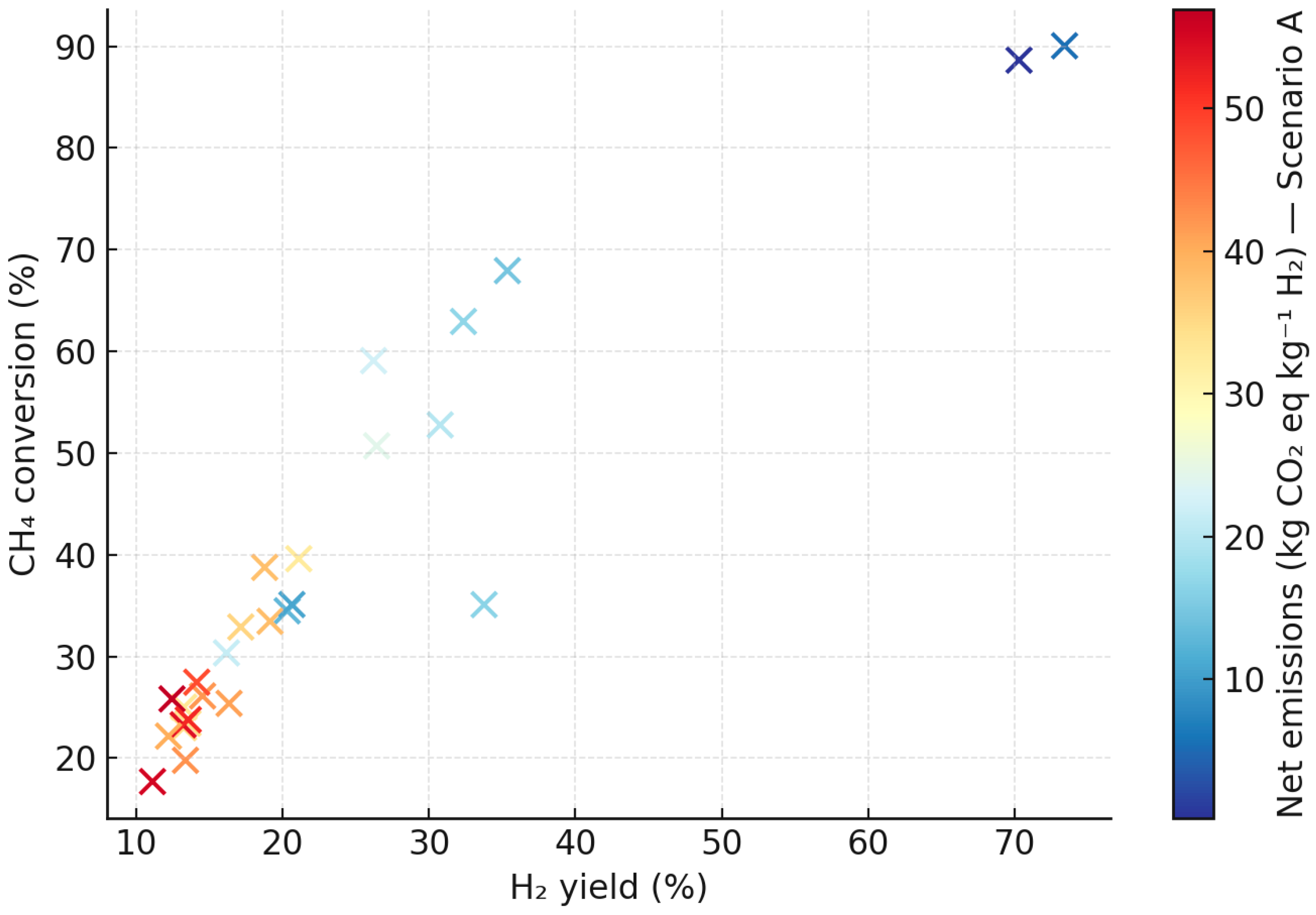 2 emissions (Scenario A). High-performance conditions cluster in the blue region (low or negative emissions), confirming that improved catalytic efficiency directly enhances life-cycle sustainability. The extended panel (