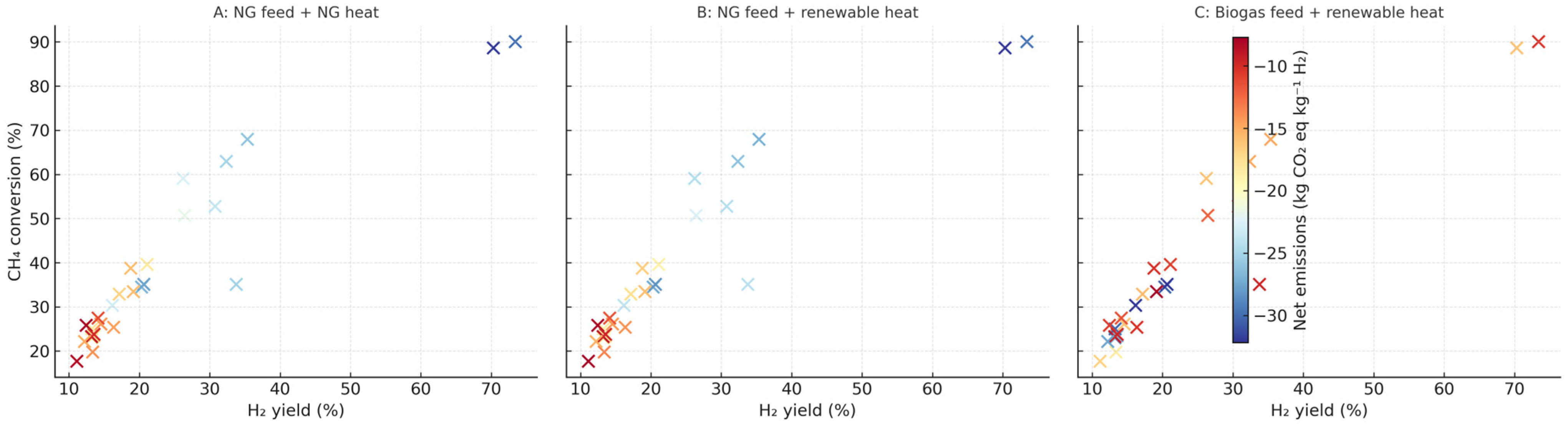 These findings demonstrate that DRM can achieve net cradle-to-gate CO2 emissions as low as +0.26 kg CO2 eq·kg−1 H2 under optimized conditions with natural gas heat and net-negative emissions (–5.9 kg CO2 eq·kg−1 H2) when powered by renewable heat. Under biogas and renewable heat (Scenario C), DRM achieves strongly negative emissions (−32 kg CO2 eq·kg−1 H2), surpassing SMR and approaching or exceeding renewable electrolysis performance.
