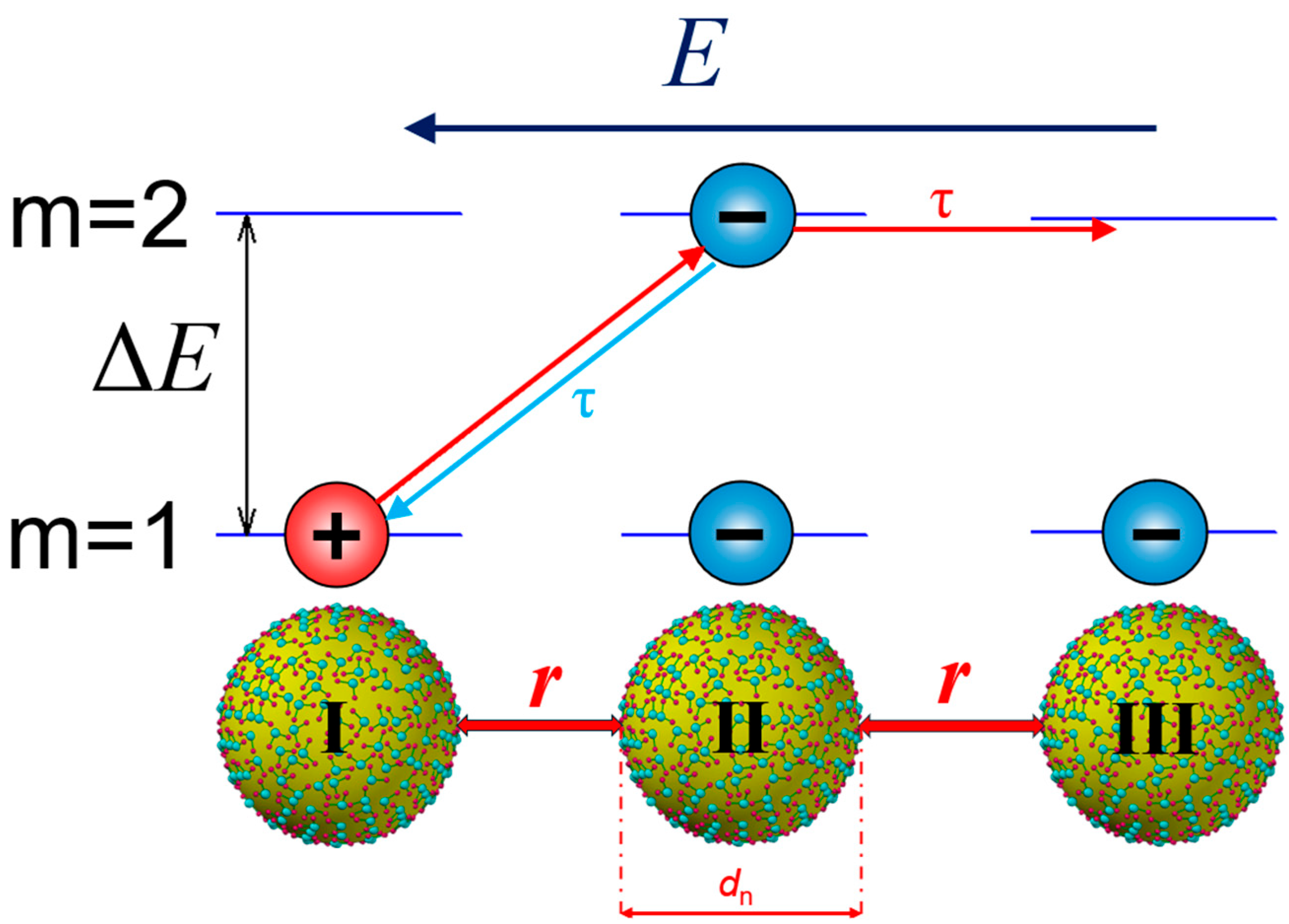 From the figure, it is evident that an electron cannot tunnel from one nanodroplet to another without a change in its energy. This results from the Pauli exclusion principle, which states that no more than one electron can occupy a given energy state. Since in a nanodroplet the ground state with m = 1 is occupied by an electron, tunnelling can occur only to the lowest unoccupied state m = 2. To accomplish this, the electron requires additional thermal energy ΔE, referred to as the activation energy. After tunnelling from well I to well II, an electric dipole is formed. Under certain conditions, with a sufficiently high concentration of dipoles, this may lead to additional thermally activated polarization. The electron remains in well II for a certain period, known as relaxation time. The existence of relaxation time arises from the fact that the electron acquires energy in the form of phonons, which does not exactly match the value of ΔE. For the electron to settle at the energy level with m = 2 after tunnelling, it must release the excess energy. This process is called thermalization and requires a certain time, referred to as relaxation time. After relaxation time, the electron may undergo one of two possible subsequent tunnelling events. In the first case, the electron may tunnel to well III, which results in the generation of a direct current (DC). In the second case, the electron returns to well I. Such tunnelling is associated with the occurrence of alternating current (AC) and the disappearance of the dipole. The model outlined above was developed in publications [33,45]. This model describes both AC and DC conductivity as well as the polarization of nanocomposites with a dielectric matrix–conductive inclusion structure.
