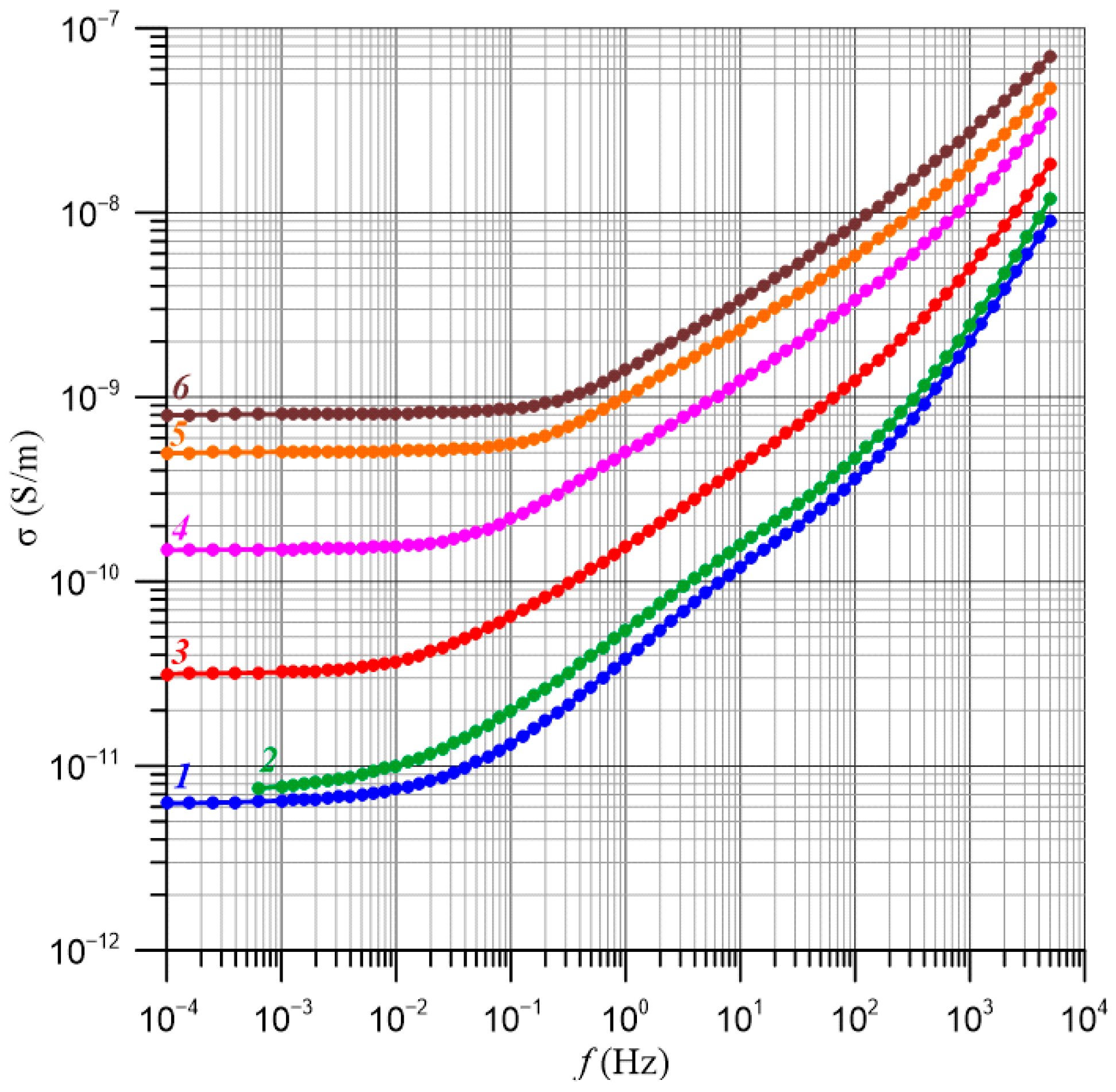Figure 4. Frequency dependence of the conductivity of the pressboard–bio-oil–water nanodroplet composite for water contents: 1—0.6 wt.%, 2—1 wt.%, 3—2 wt.%, 4—3 wt.%, 5—4 wt.%, 6—5 wt.%, shifted along the Y-axis to match the conductivity for 2% water content at a frequency of 10−4 Hz. Measurement temperature: 70 °C.