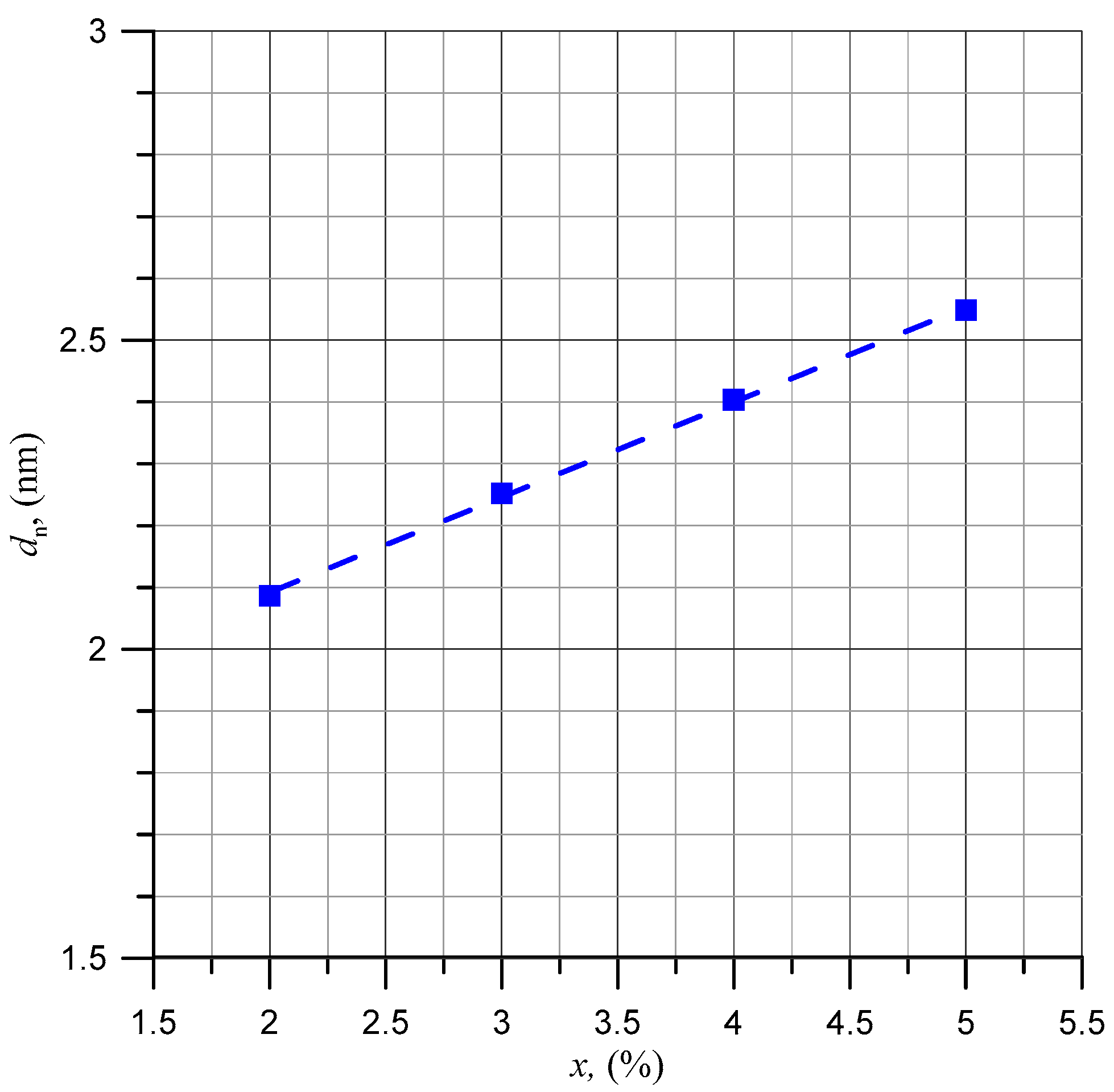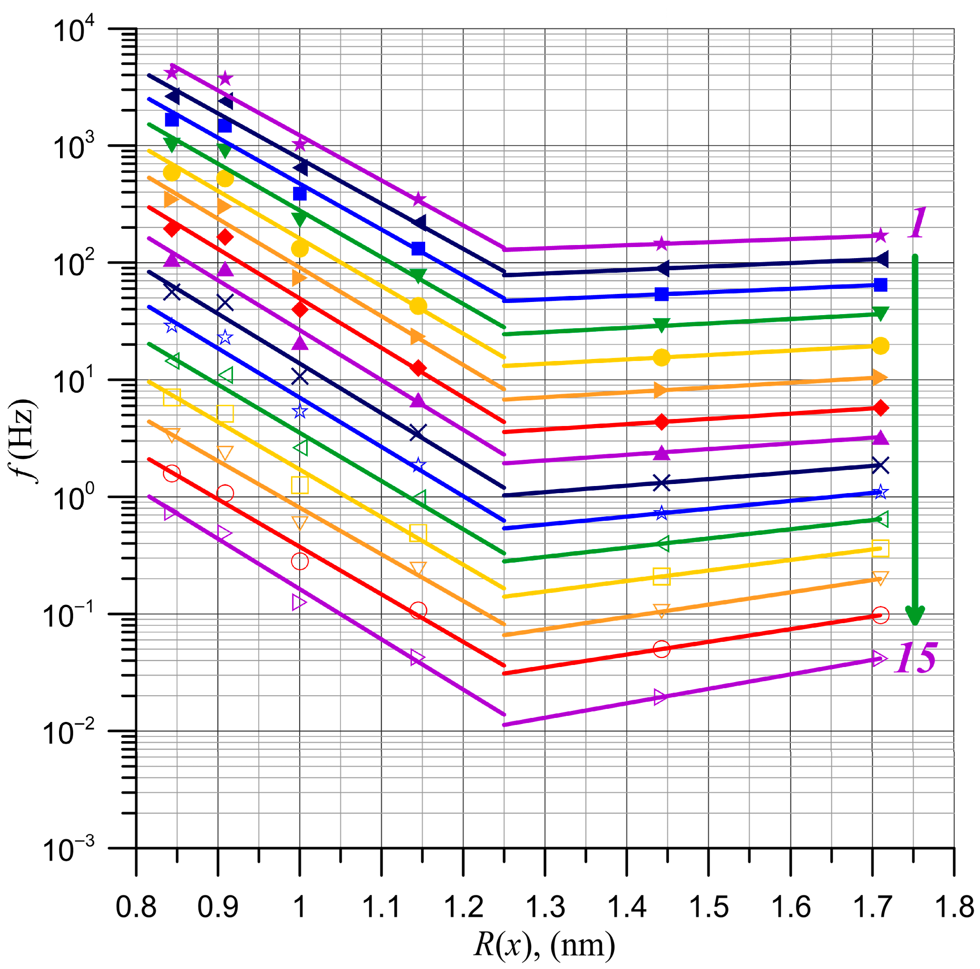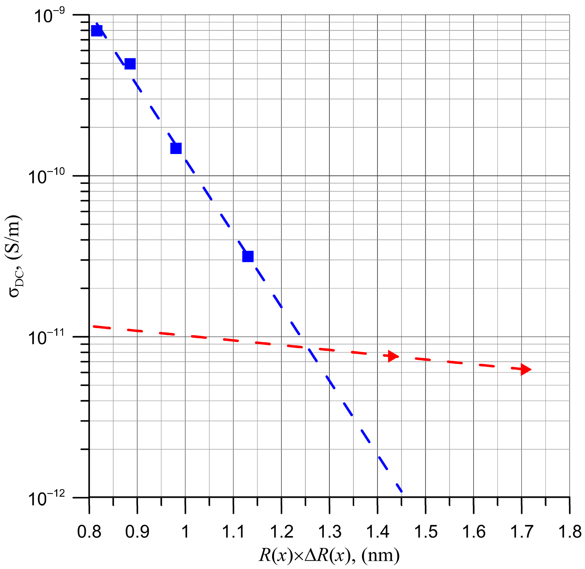 From Figure 2, it can be seen, that in the low-frequency region, the conductivity is independent of frequency. This corresponds to DC conductivity. Based on the values of the DC conductivities, their dependence on the distance between water molecules R(X) was determined using Equation (6). The results are presented in Figure 3.