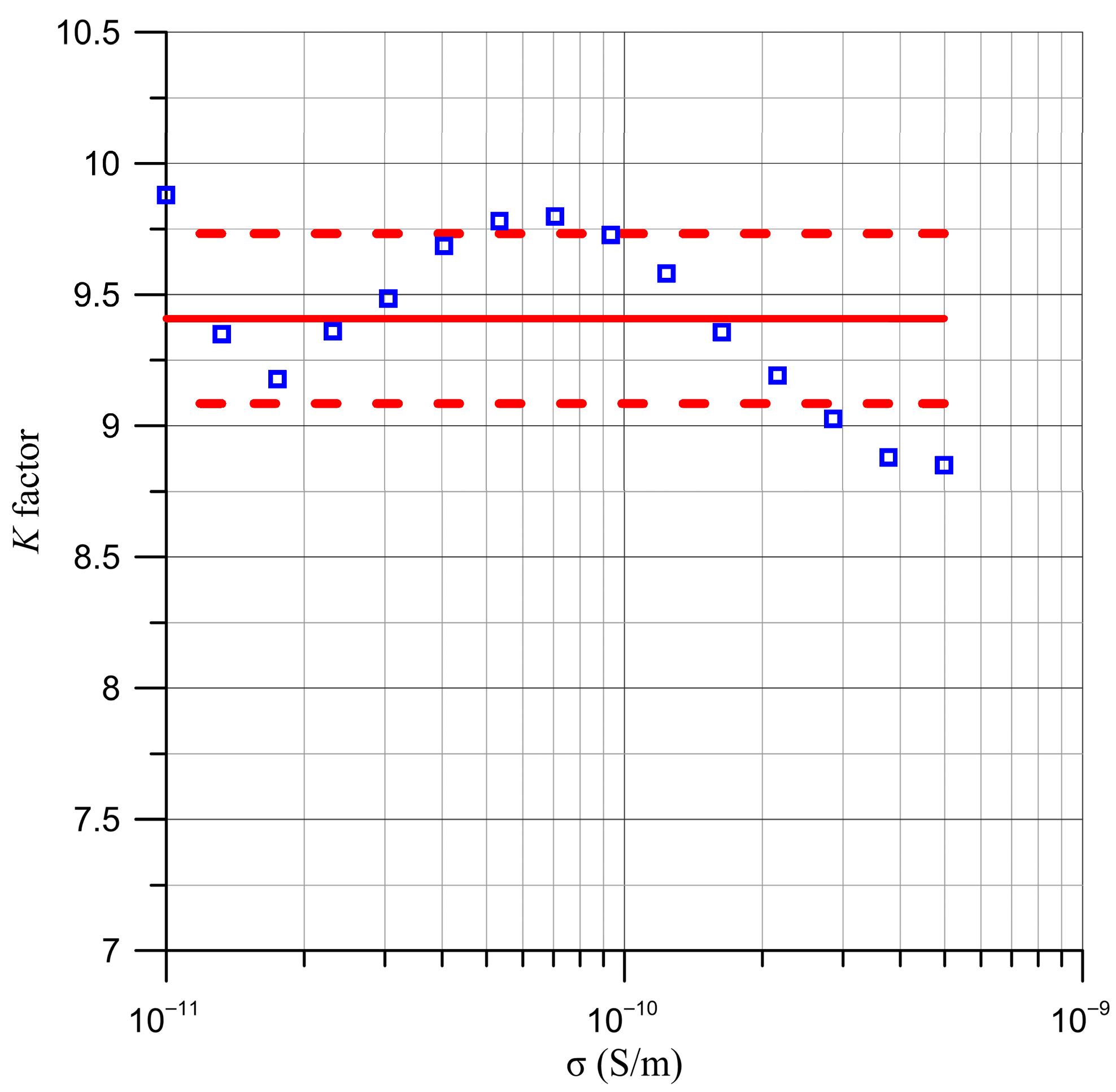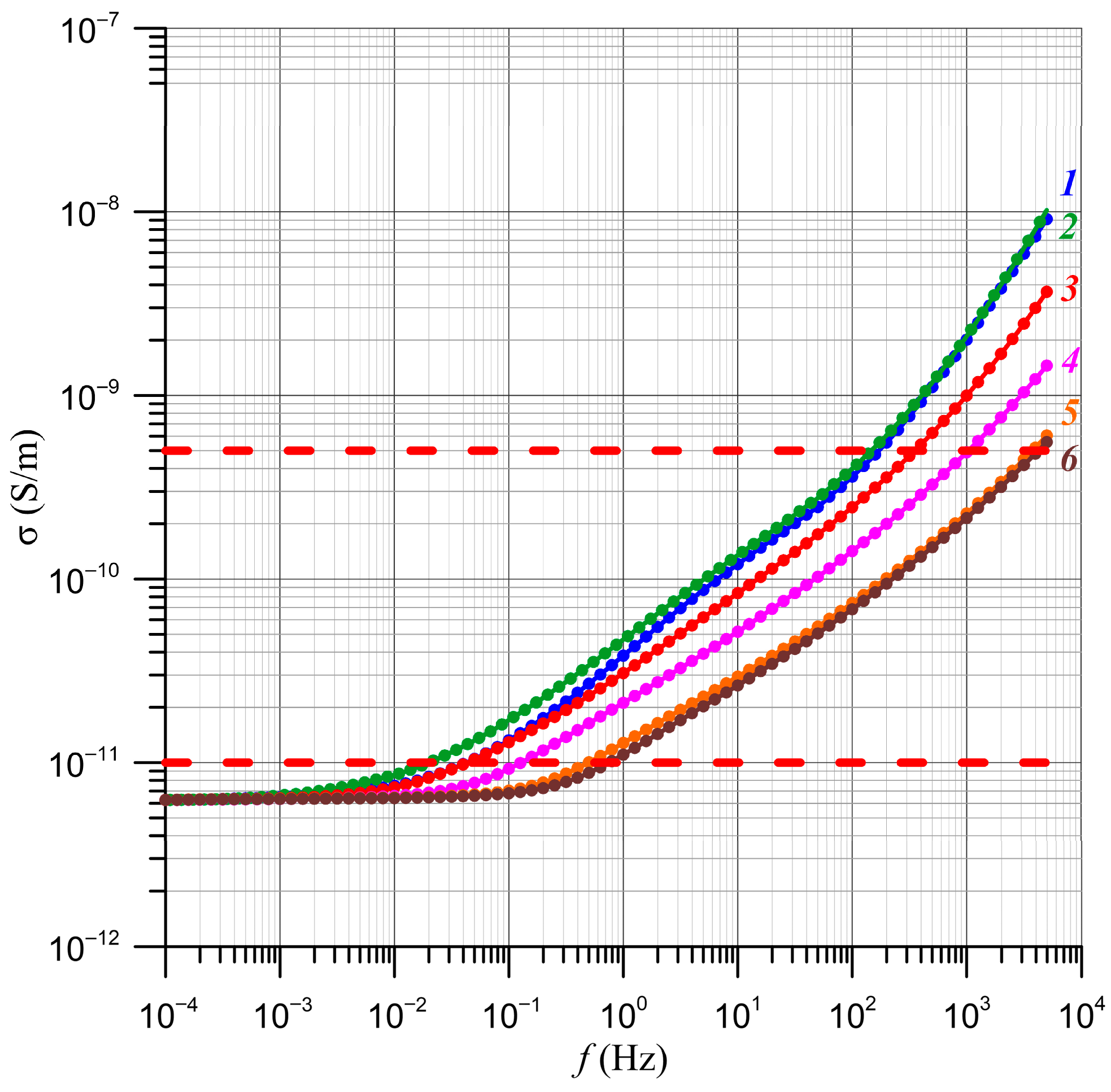 Figure 2 shows the experimental frequency dependences of conductivity for pressboard samples with moisture contents ranging from 0.6% to 5%, measured at a temperature of 70 °C. Any temperature within the range of 20 °C to 70 °C could be selected. The temperature of 70 °C was chosen because it is close to the temperature occurring during transformer operation under load. Equation (19) allows the results obtained for a temperature of 70 °C to be converted to any other temperature.