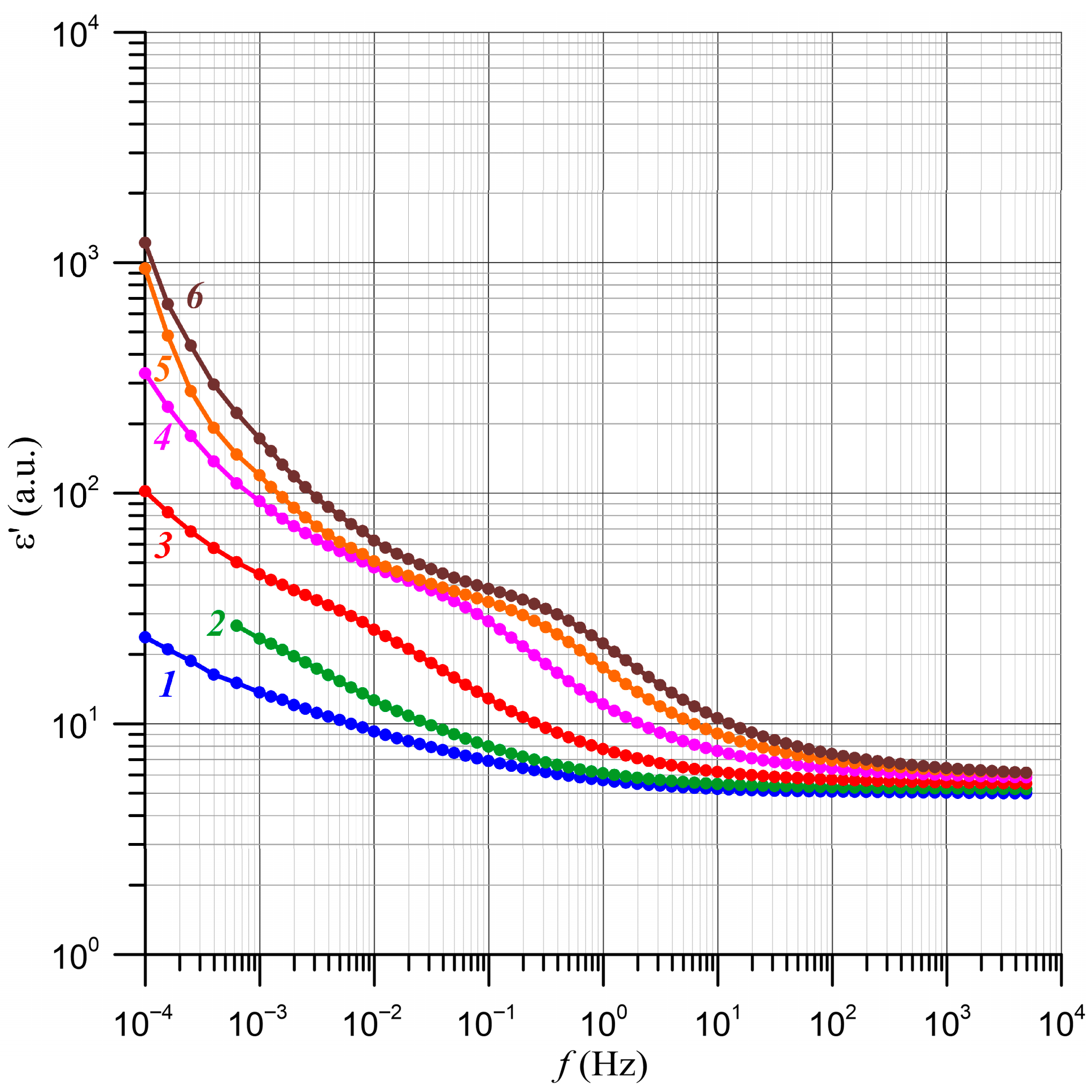 Figure 7. Frequency dependence of the permittivity of the pressboard–bio-oil–water nanodroplet composite for water contents: 1—0.6 wt.%, 2—1 wt.%, 3—2 wt.%, 4—3 wt.%, 5—4 wt.%, 6—5 wt.%. Measurement temperature: 70 °C.