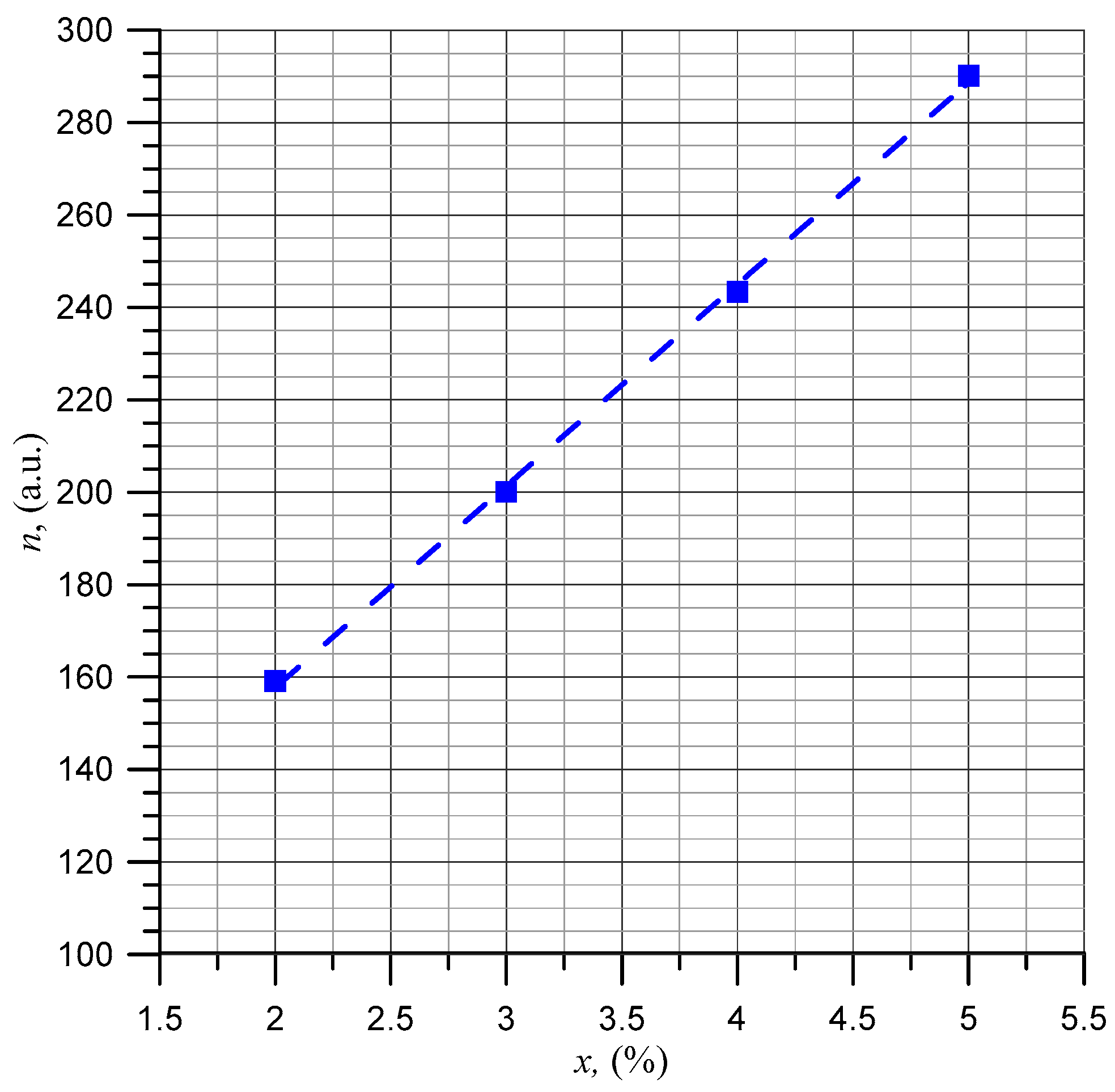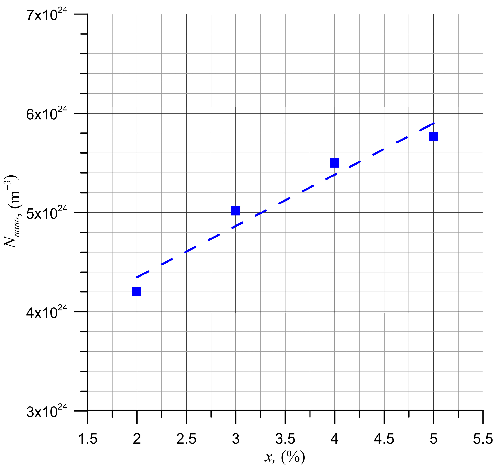 Figure 9. Dependence of the concentration of water nanodroplets on the percentage of water content in the composite.