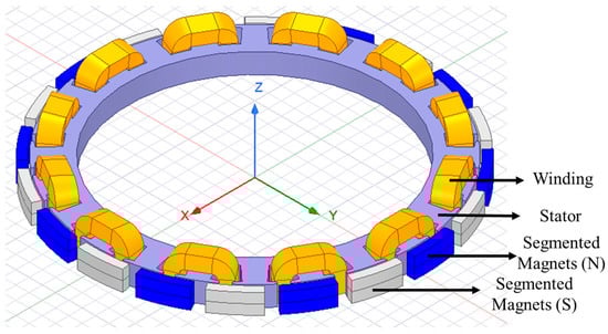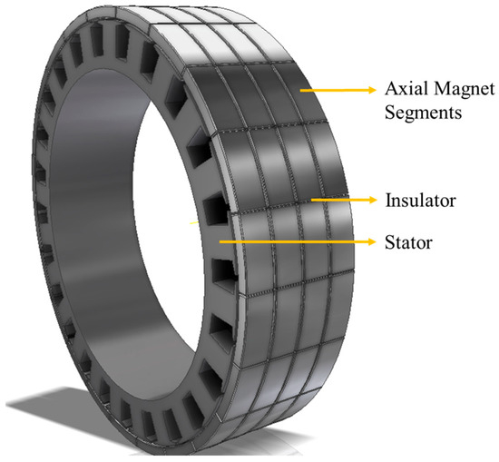 After the conventional design analysis, the implementation of segmented PMs, which is the main concern of this study, is taken into account. The main aim is to investigate the torque improvement of the PMSM with axially segmented PMs. Of course, a similar study with radially segmented PMs can be conducted. Also, the proportion of PM eddy-current loss in total losses will be examined. As mentioned before, the segmentation of PMs results in a reduction in motor losses and it is foreseen that an improvement in motor torque will be achieved. The motor with radially assembled and axially segmented PMs is shown in Figure 5. The back iron of the motor is removed to better understand the motor structure in the figure.
