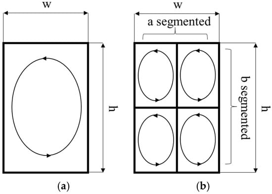 A lumped representation of one eddy-current loop on a monolithic PM with a horizontal length of w and a vertical length of h is shown in Figure 2a. Figure 2b shows that the magnet is segmented into a and b segments horizontally and vertically, respectively. The segmentation constitutes nine eddy-current loops and indicates that the effect of eddy-current loss is diminished. If the induced voltage of the monolithic magnet loop is E, then for the segmented version, each PM segment has an E/ab-induced voltage and the path length of each loop is 2(w/a + h/b), as expected. Assuming that there is a magnet in Cartesian coordinates, for a constant magnetic field along the z-axis, the magnetic field of PM can be expressed as follows [29,30,31]: