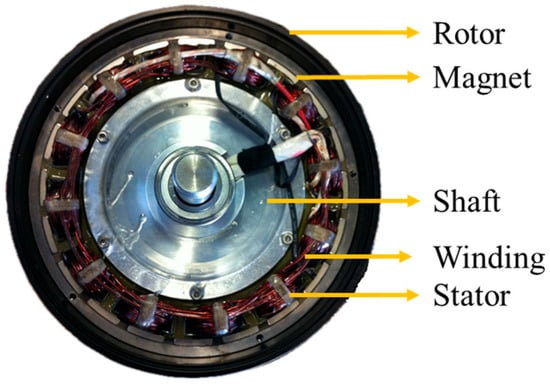 Among different PMSM topologies, in-wheel (hub-type) PMSMs have recently attracted significant attention. Hub-type BLDC motors, as special types of PMSMs, are dominant in propulsion systems of LEVs, such as e-bikes, e-scooters, and small electric cars. To improve the dynamic performance of BLDC motors, studies have focused on optimizing many design criteria, especially the rotor and stator structure. Most studies rely on FEA of electromagnetic structures. This has led to the emergence of several commercial analytical software packages [10,11]. Those efforts have resulted in many high-performance motor designs and many researchers have verified that the experimental results and analysis results agree in most cases.
