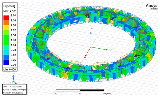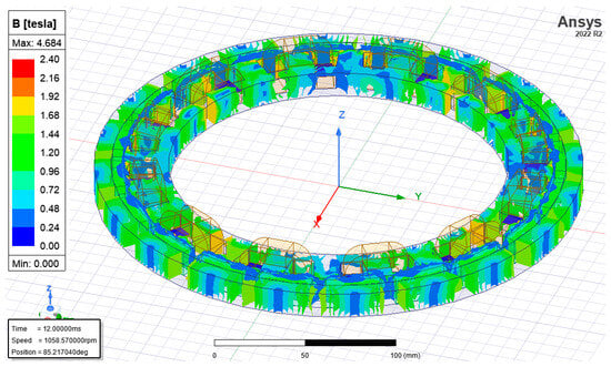 In Table 2, it is shown that the targeted values are in agreement with the results of the analysis; however, there is still a need for experimental verification. In this phase of the study, ANSYS Electronics Desktop 2022 R2 software, specifically its Maxwell 3D module, is used to investigate the design modifications. FEA shows that the magnetic flux distribution is appropriate and the flux density values do not exceed the limits of the selected core material except for a few small spots, i.e., stator tooth edges, as expected. Figure 4 shows an electromagnetic analysis of the motor. The flux density reaches a value of approximately 2.4 T in the tooth edges, which implies the beginning of saturation.