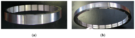 After thorough analyses and simulations, the designed PMSM is manufactured. For experimental comparison, two different magnet assemblies with monolithic and two-segment PMs are fabricated. The experimental work is conducted by changing two magnet assemblies and back-irons, i.e., the outer rotor, using a single stator structure. The two different outer rotors are presented in Figure 8, where the monolithic and two-segment PMs can be seen explicitly.