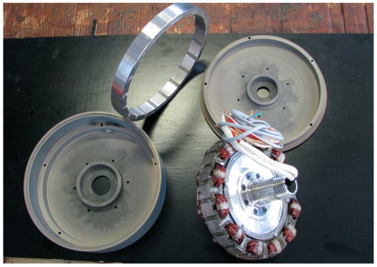 The electric motor that is the subject of this study is an outer rotor PMSM that is designed especially for direct-drive LEV propulsion. As we know, LEVs are frequently used in methods of urban and personal transportation such as e-bikes, e-scooters and small cars. Outer rotor electric motors are preferred in direct-drive LEV propulsion with single- or multi-motor power trains. The exploded assembly of the in-wheel motor that is the subject of this study is shown in Figure 3.