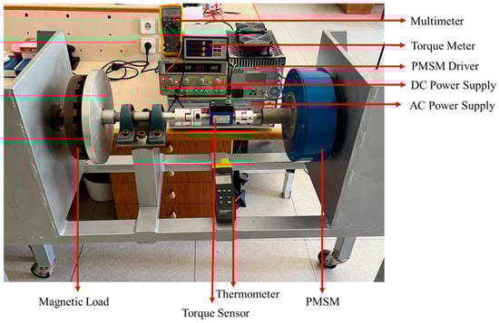 The test bench is seen in Figure 10. During the experiments, the ambient temperature was kept constant between 21–22 °C by a controlled HVAC system. The motor is operated by an industrial sinusoidal drive. The loading mechanism is an eddy current brake system adjusted by a variable air-gap PM assembly and an aluminum disc. The system operates with relatively acceptable precision due to its mechanical limitations. All electrical and mechanical measurements were obtained using high-precision measuring devices. The prototyped PMSM was driven by a microcontroller implementing sinusoidal control. All electrical and mechanical noises were snubbed using special filters and components. The DC-link voltage, DC-link current, RMS motor terminal currents, motor speed, output torque, and input power were measured and the rest of the related performance values were calculated.