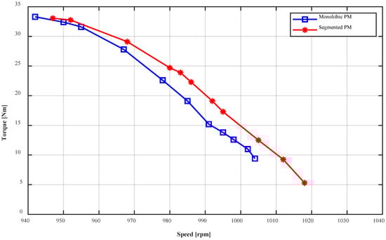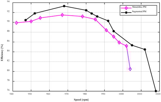 To visualize the comparison, the motor efficiency versus speed variation is given in Figure 11 for both motors. The improvement in output torque, efficiency, and MTPA for the two-segment PMs is obvious. The experimental study also verifies the previous design analyses. The torque is increased by 1.2% compared to the motor with monolithic PMs, as calculated previously. Due to the availability of PMs and limitations in the manufacturing process, no further segmentation could be performed. But even in this case, the results are very promising.