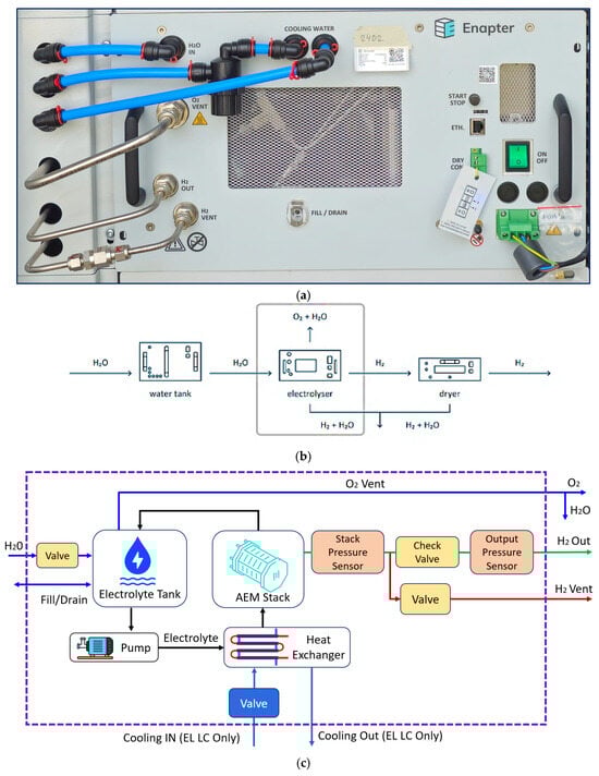(a) Actual EL4.1 electrolyzer unit, (b) connection with electrolyzer, water tank, and H2 dryer, and (c) schematic illustration of AEMEL operation.
