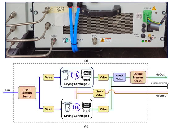 Enapter hydrogen dryer. (a) Front end and connectors of real unit. (b) Schematic of H2 dryer operation.