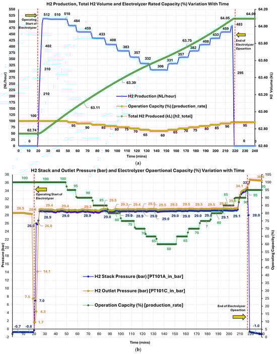 (a) Real-time H2 production rate (NL/h), total cumulative H2 produced (kL), and operational capacity percentage over time; (b) real-time hydrogen stack pressure (bar) and outlet pressure (bar) variation with operational capacity (%).