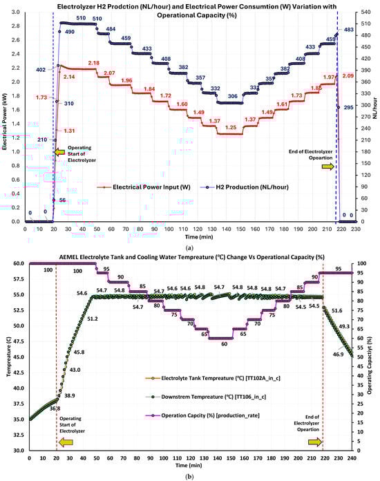 The relationship between the AEMEL electrical power input (PEL,in) and H2 production is illustrated in Figure 6a. Upon start-up, the electrolyzer exhibits a rapid increase in both PEL,in and H2 generation, with production reaching 512 NL/h at a stabilized PEL,in of ~2.18–2.24 kW during 100% OP%. This stage demonstrated exceptional load acceptance, with near-linear scaling in both electrical and H2 outputs and no noticeable overshoot or instability. As OP% was reduced (5% steps), H2 production and PEL,in decreased proportionally. At the minimum OP% of 60%, H2 ~306 NL/h, it corresponded to PEL,in~1.25 kW, indicating that the system maintained efficient operation at PL. Also, step-down and subsequent step-up trajectories displayed strong symmetry, confirming hysteresis-free ramp-up/down behavior. The system’s efficiency, denoted by H2 yield per unit of power, remained consistent, due to the efficient electrochemical conversion process. The significant drop in PEL,in and H2 output at the end coincided with internal shutdown with a fully charged H2 tank. Following this event, both PEL,in and production fell to zero, regardless of setpoint, verifying safety and interlock protocols’ correct enforcement. Throughout dynamic loading, no irregularities were observed in either electrical consumption or production. The electrolyzer maintained stable and efficient performance across a broad operating envelope.