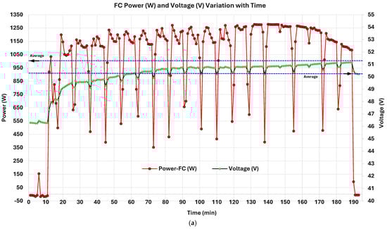 The deviations observed between the experimental results and manufacturer’s specifications are well within normal operating variability for commercial AEMELs. The marginally higher H2 production rate (+2.4%) is due to favorable stack temperature conditions and standard flow-sensor tolerances, while the lower power consumption (−10.8%) replicates improved steady-state efficiency and conventional nominal ratings provided by the manufacturer. The operating pressure remained below the maximum allowable 35 bar because the tests were conducted under standard laboratory safety limits; also, the elevated coolant temperatures are due to ambient laboratory conditions and heat accumulation during extended runs. Overall, these differences are expected and fall within acceptable engineering tolerances for real-world electrolyzer operation.