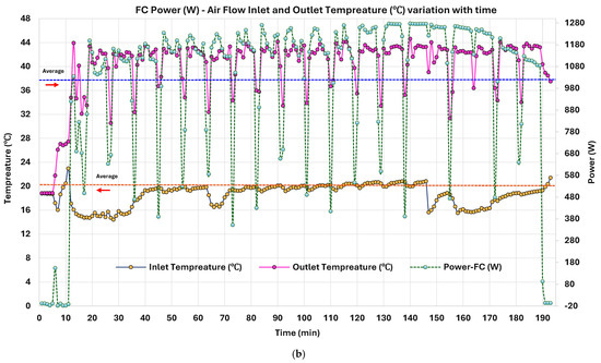 The FC is an Intelligent Energy IE-Lift 1T/1U, a proton exchange membrane (PEM) type (Figure 4a). The PEMFC provides a nominal PFC of 0.96 kW at 24 V, with a maximum continuous PFC of 1.2 kW at 48 V. It sustains a through-life 1.0 kW output. The FC operates at maximum current of 50 A at ≤ 24 V and 25 A at 48 V, with a selectable Voutput of 24 V, 36 V, and 48 V. H2 consumption is specified as <70 g H2/kWh. The back end of the FC (Figure 4b) illustrates H2 input, PFC output, and communication/control connections. The PEMFC operating temperature ranges from +5 °C to +35 °C. Notably, the PEMFC is not configured for rapid or step-load transitions, rather it is operated at a 100% fixed rate. During testing, the FC’s PFC output was transmitted to the BESS for charging, while low-grade thermal energy from airflow was available for WHR, enabling potential cogeneration.