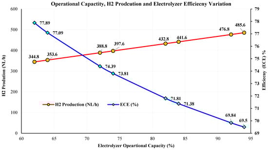 Figure 5a illustrates the real-time H2 production (NL/h), total cumulative H2 produced (kL), and operational capacity (OP%) variation with time. The operational performance of the AEMEL was evaluated under dynamic loading, demonstrating stable and responsive behavior across its full operating range. The system, initially set at 100% capacity with H2 production ramping from zero to 510 NL/h within minutes, indicates rapid start-up and minimal transient lag. Under steady-state full-load conditions, production remained highly consistent (509–512 NL/h). A subsequent stepwise reduction in OP%, in 5% increments down to 60% (manufacturer-defined minimum OP% threshold), showed a smooth and proportional decline in H2 output, with no signs of instability or control degradation. At 60%, the electrolyzer remained stable, producing ~305 NL/h. The reverse sequence (60% to 95%) yielded similarly consistent results, confirming hysteresis-free control characteristics. Notably, upon reaching 95% during the ramp-up phase, H2 production automatically ceased due to the H2 storage tank reaching full capacity, activating system-level shutdown. This safety-driven interlock performed as intended, overriding manual setpoint control. Cumulative H2 production increased monotonically from 62.74 to 64.09 kL, resulting a net yield of ~1.35 kL.