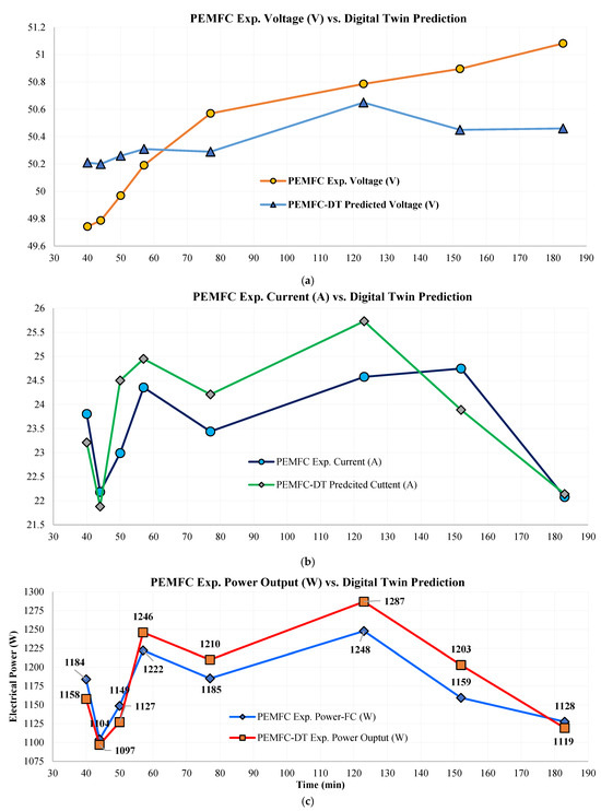 H. Naanani et al. (2025) [83] reviewed DT applications across the hydrogen value chain, highlighting benefits such as real-time monitoring, predictive maintenance, and up to 12% efficiency gains in electrolyzers. The challenges noted include data quality, computational demand, and cybersecurity. Shaojie Liu et al. (2025) [84] introduced a behavior-matching DT for PEM electrolyzers, reducing real-time error by 65% and improving accuracy under fluctuating renewable inputs. Sudarshan Chavan et al. (2017) [85] used a MATLAB (R2024b (version 24.2))/Simulink model to show the impact of double-layer capacitance on PEMFC performance, especially at low loads. Zheng Zhou et al. (2024) [86] developed a PEMWE DT focusing on thermal management, enabling sensor-less temperature monitoring to enhance large-scale system stability. Ming Zhang et al. (2023) [87] proposed a DT-LSTM model for real-time remaining useful life (RUL) prediction of PEMFCs using minimal online data. Francisco Javier Folgado et al. (2023) [88] developed and validated a digital replica of a six-cell PEM electrolyzer using an equivalent circuit model based on cell-specific internal resistance obtained via MATLAB curve fitting. A PLC–LabVIEW DAQ system supports accurate data collection, and the DR closely matches the experimental voltage, power, efficiency, and hydrogen production. The approach uses scalable commercial components, is computationally light, and can be applied to other electrolyzer designs. Future work includes model comparison, predictive control, and dynamic PEMEL modeling. Safa Meraghni et al. (2021) [89] propose a data-driven DT prognostics method for predicting PEMFCs’ remaining useful life (RUL) by continuously updating a degradation model with real-time measurements. Using a stacked denoising autoencoder, the DT maps stack voltage to RUL and adapt to varying conditions, achieving over 0.9 accuracy even with limited data, supporting future predictive maintenance strategies.
