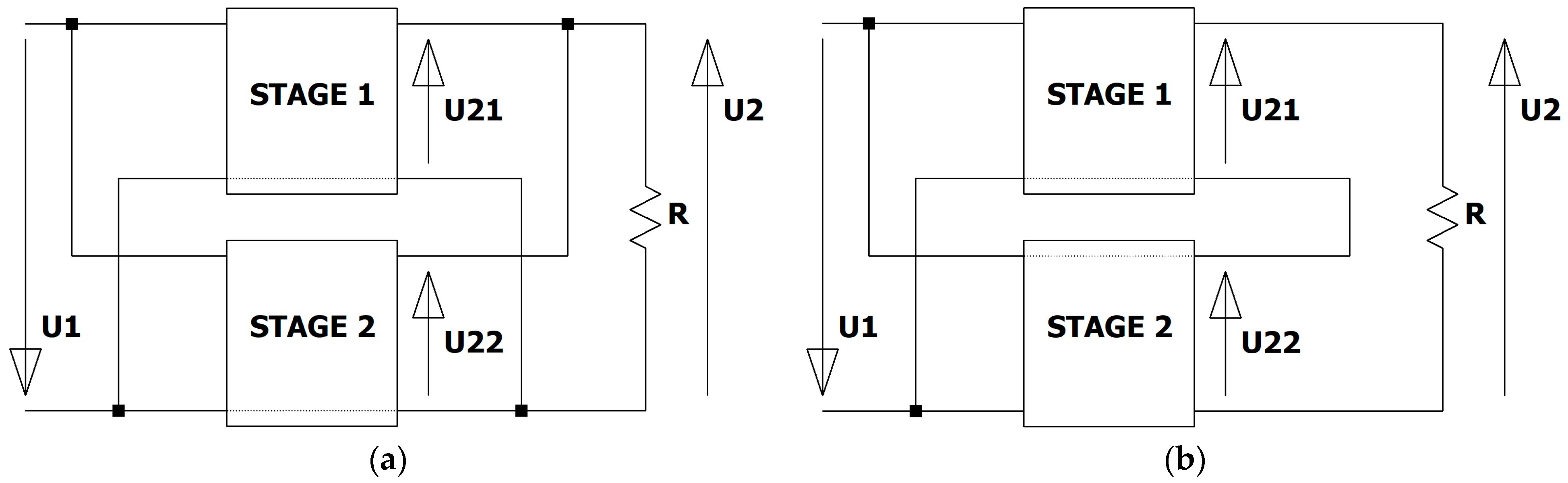 Possibilities to combine two DC/DC converters connected in parallel at the input sides: (a) interleaved; (b) floating with serial outputs and input voltage included.