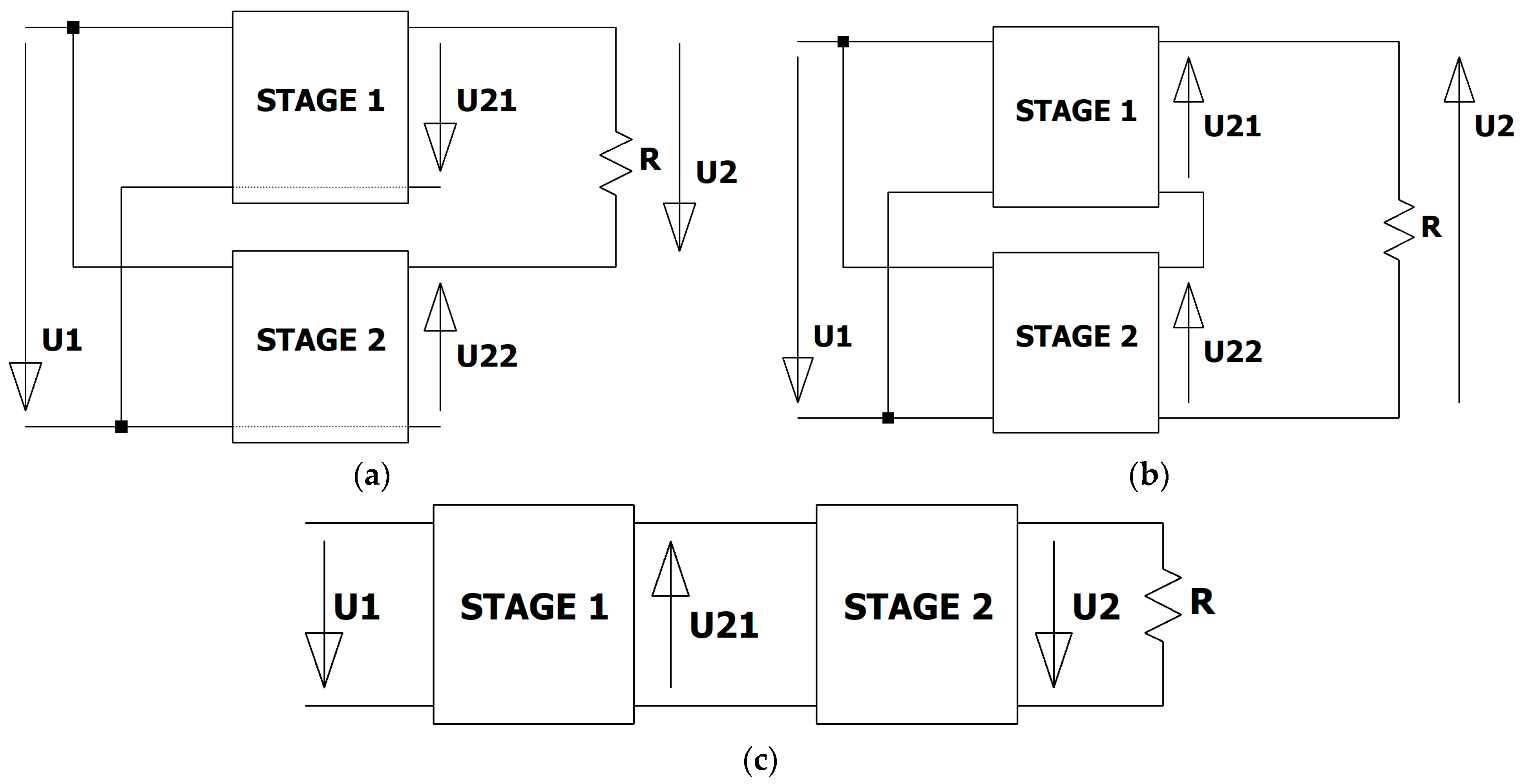 Possibilities to combine two DC/DC converters connected in parallel at the input sides: (a) floating with series output; (b) combination with serial output; (c) cascaded inverting converters.