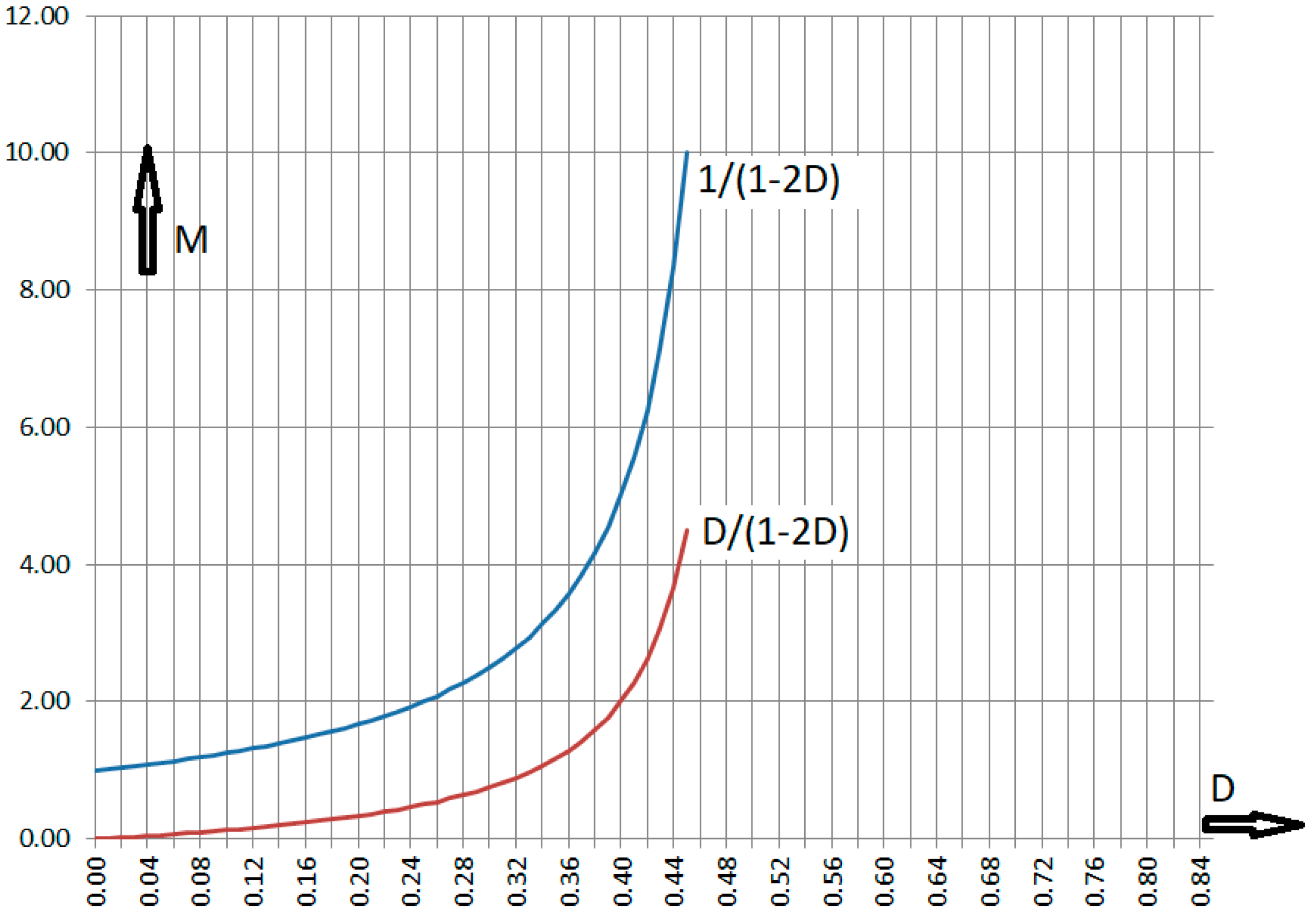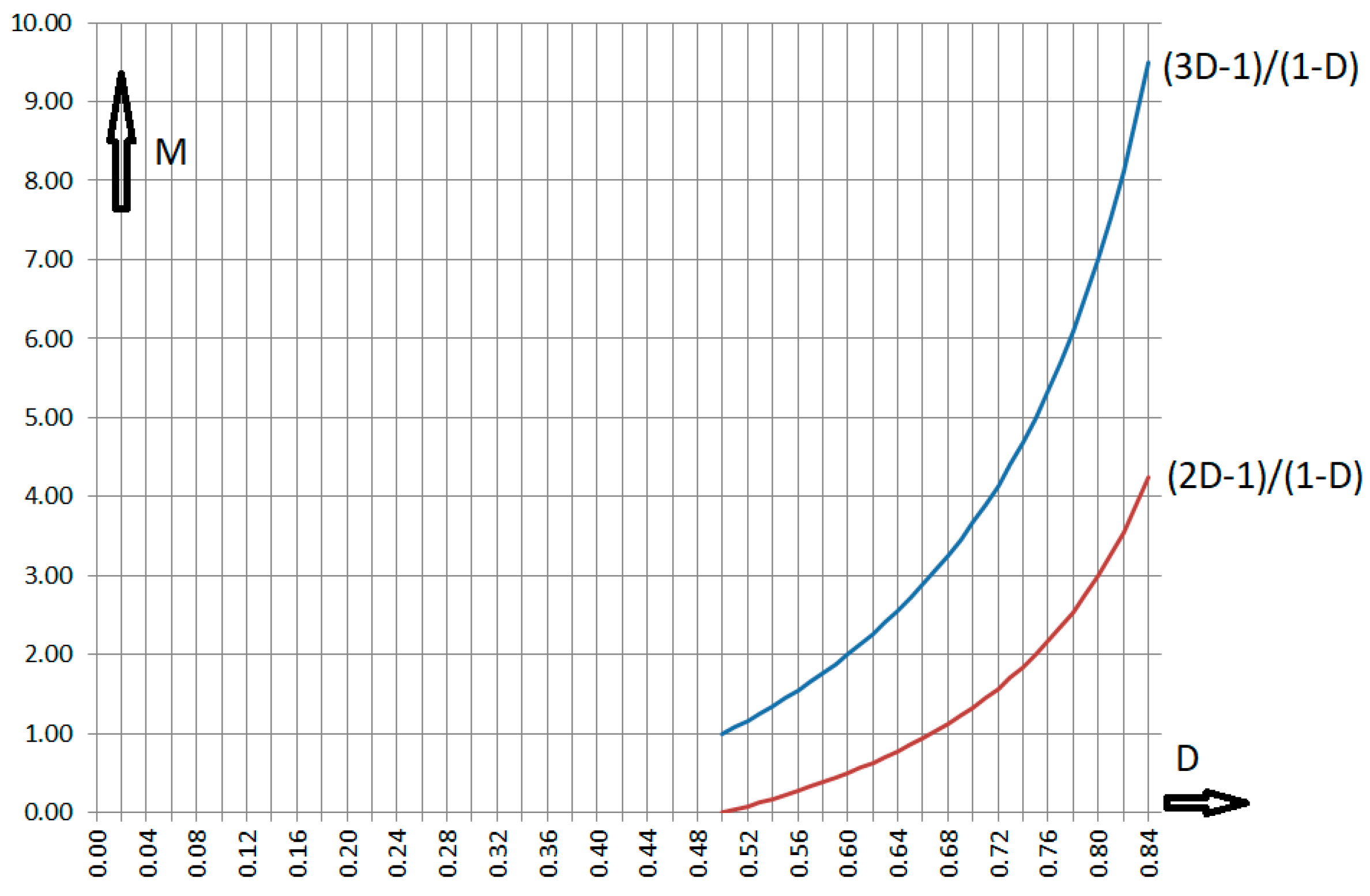 Voltage transformation ratio M in dependence on the duty cycle D: lower line—M of one stage; higher line—M of the complete converter.