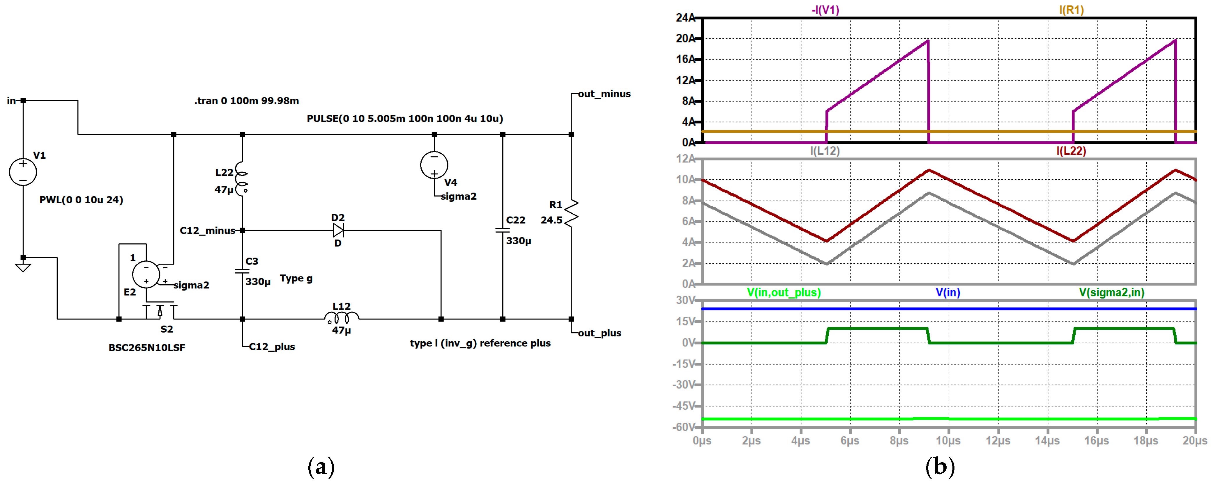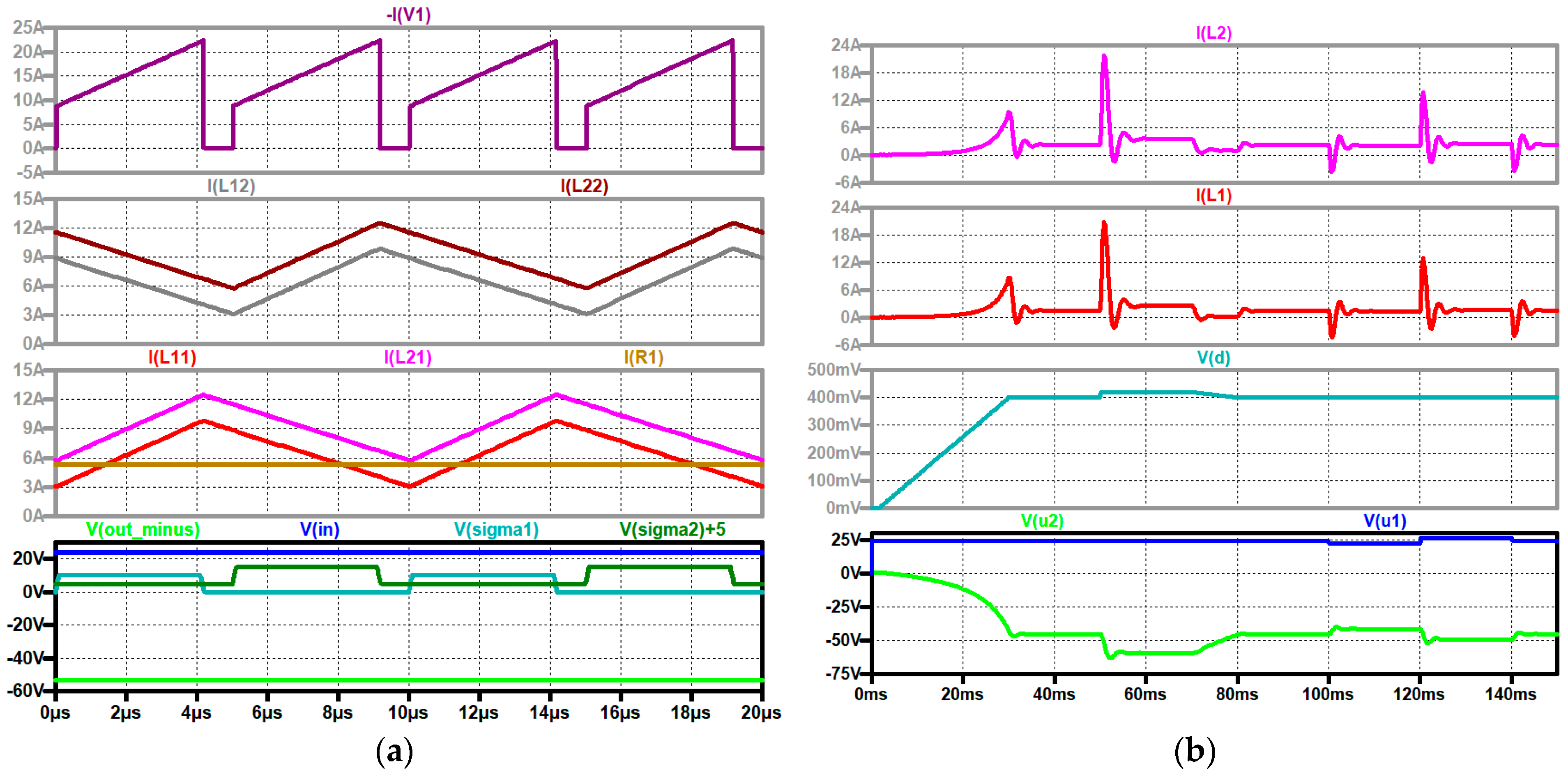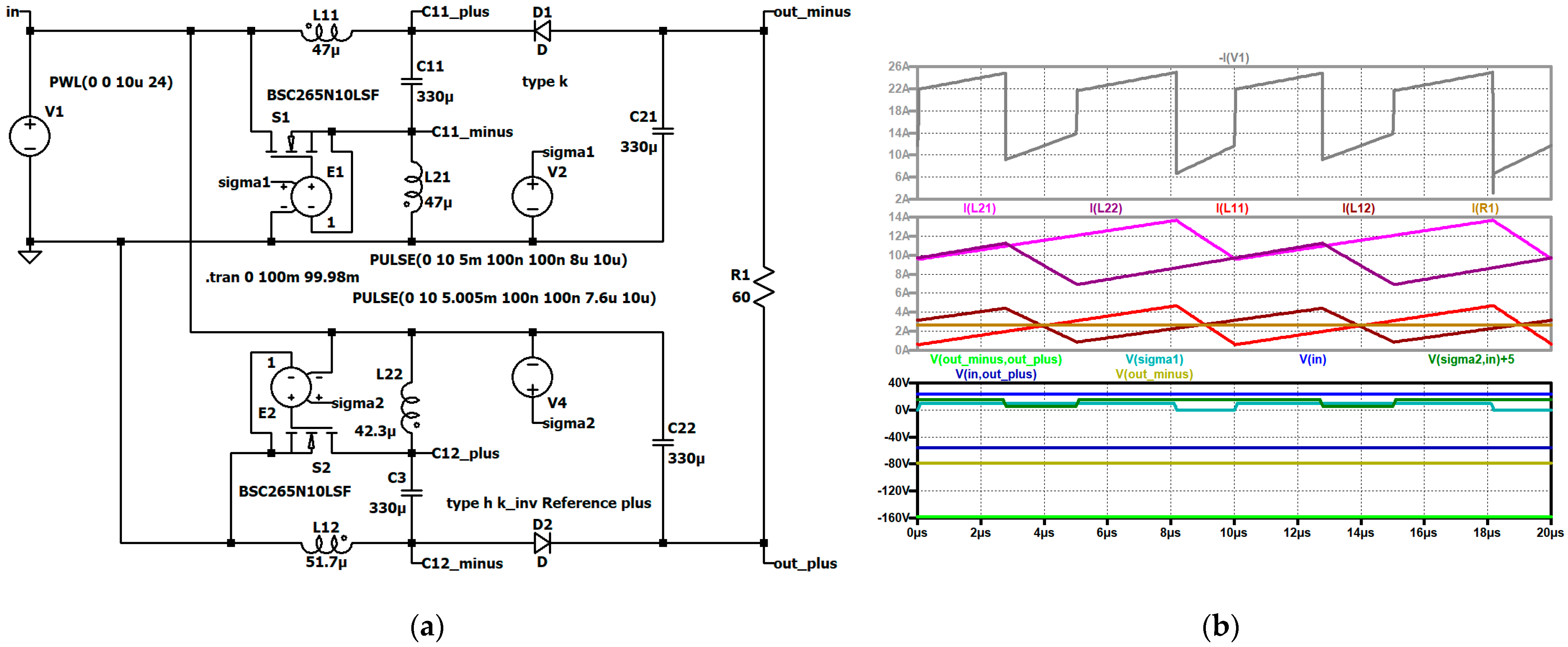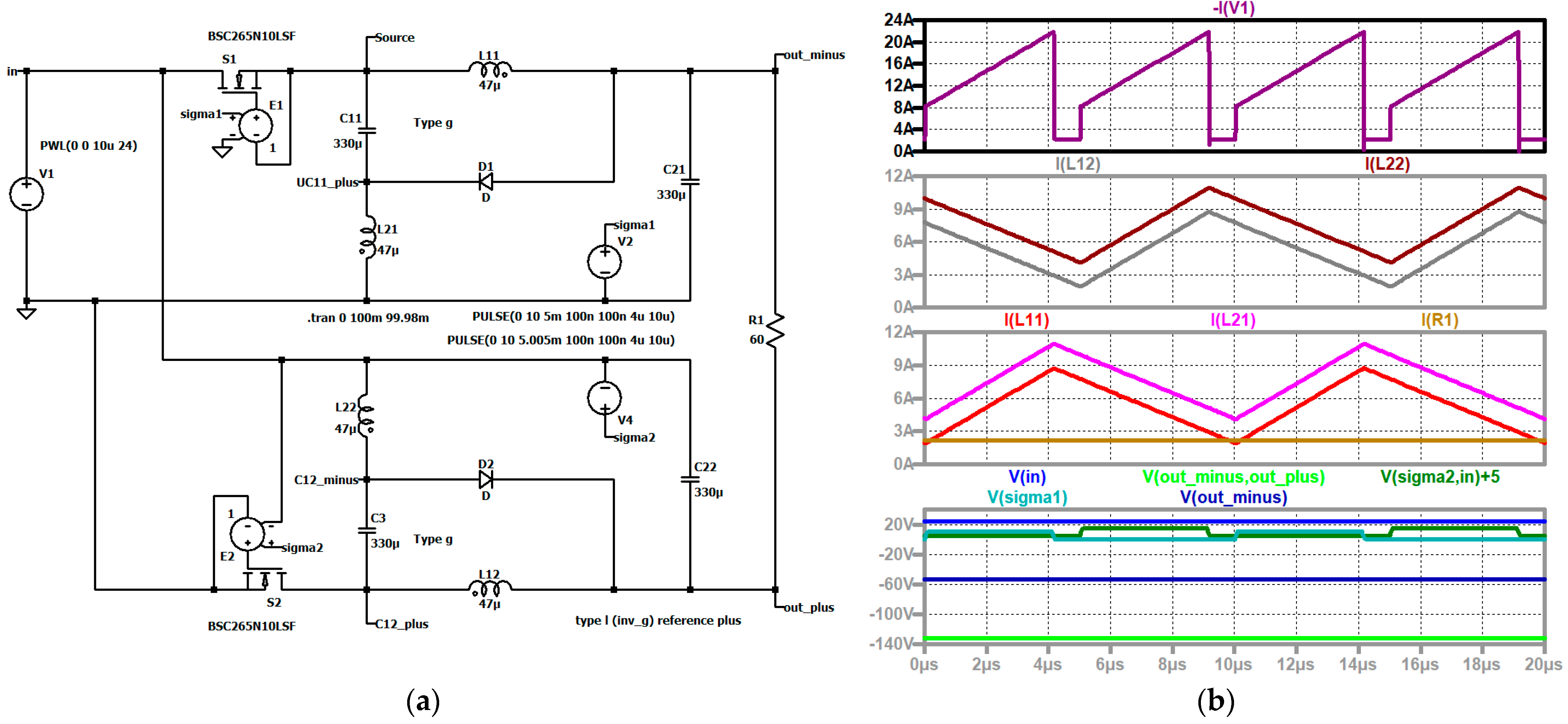 Type IV: (a) Simulation circuit. (b) Top to bottom—current through the second coil (violet); current through the first coil (red); duty cycle (gray); input voltage (blue), output voltage (green).