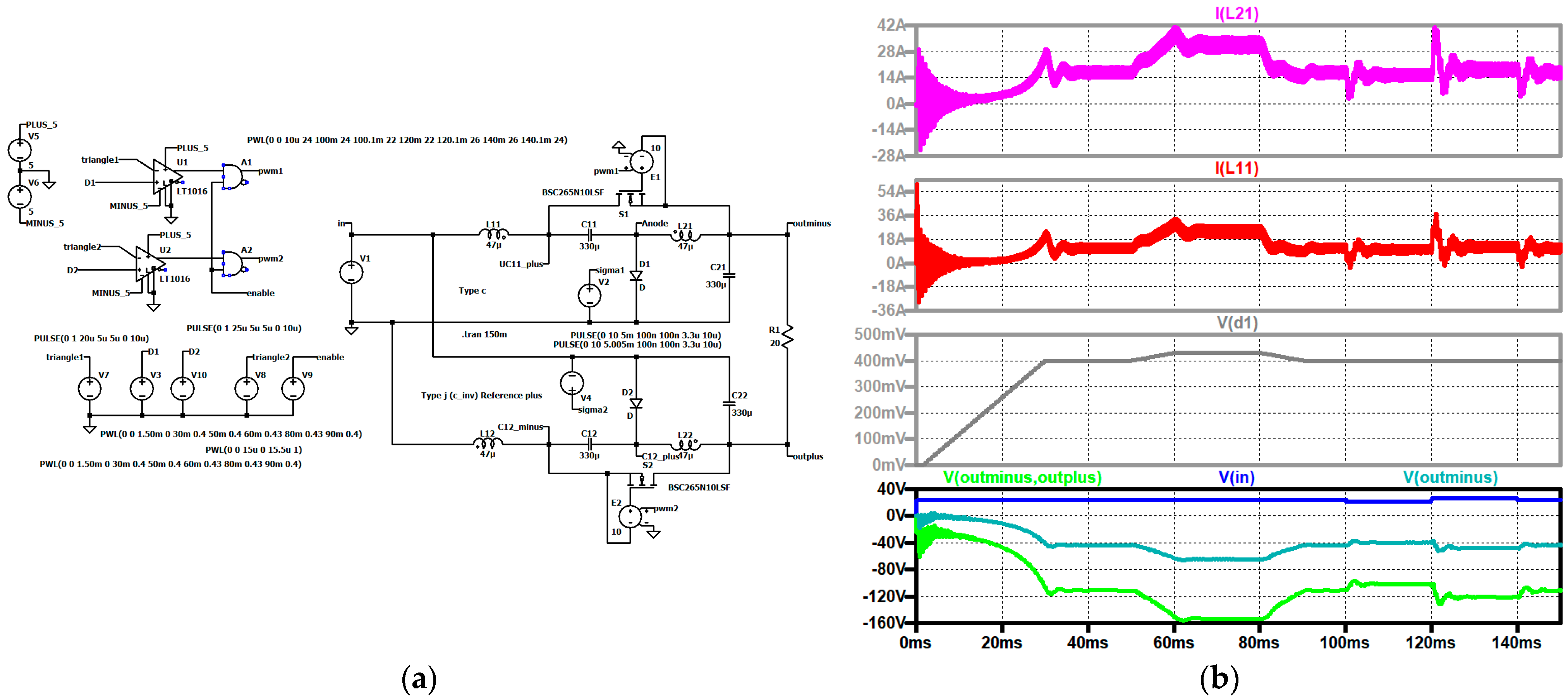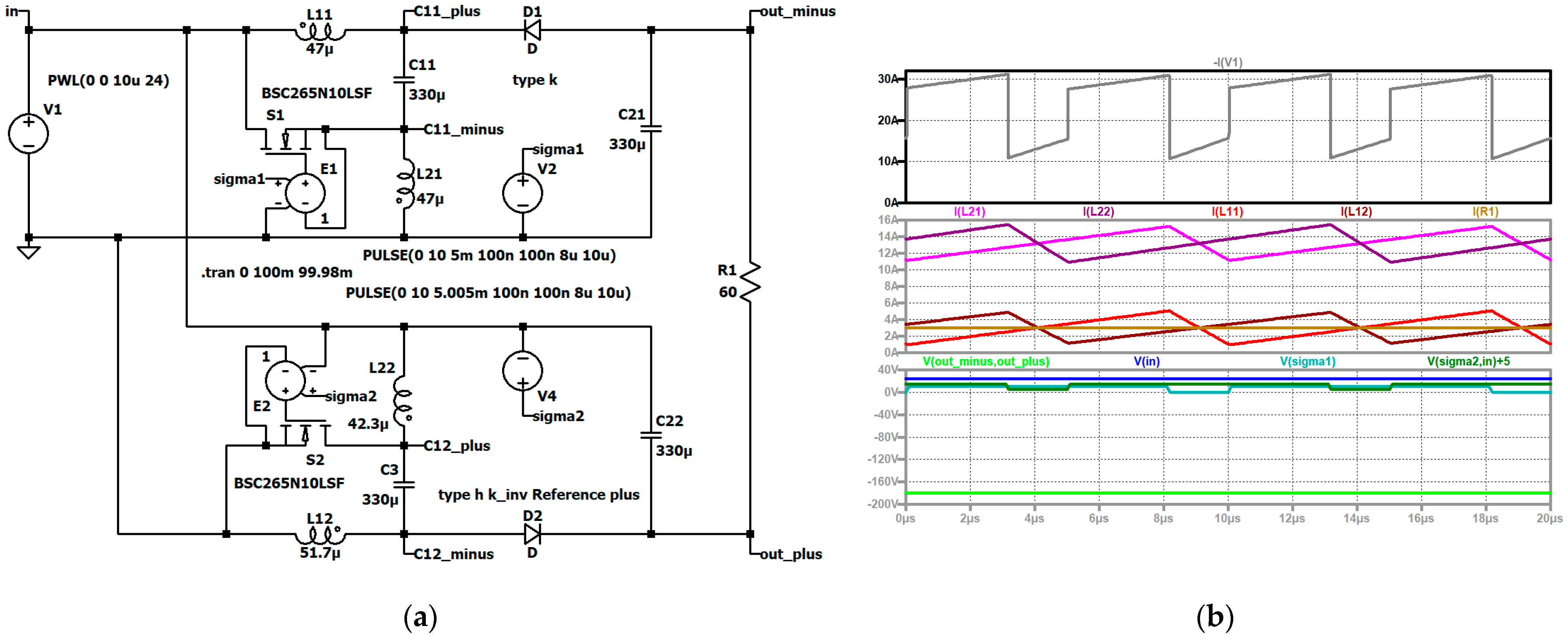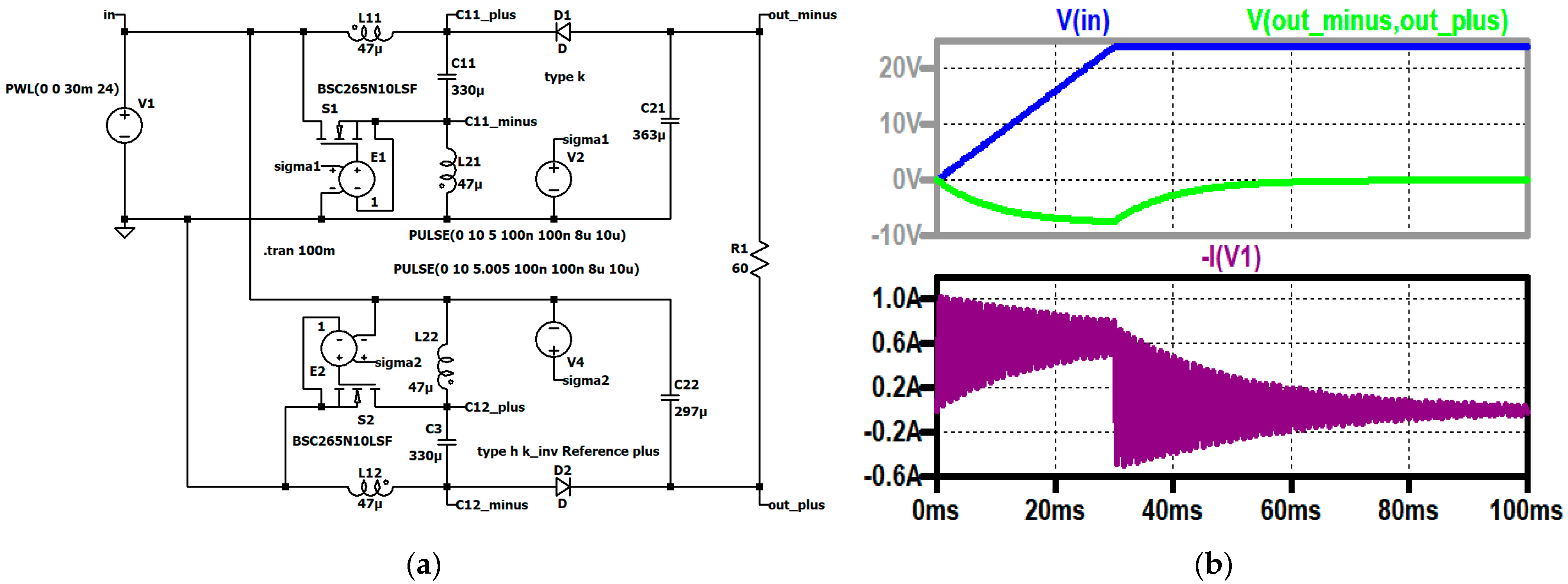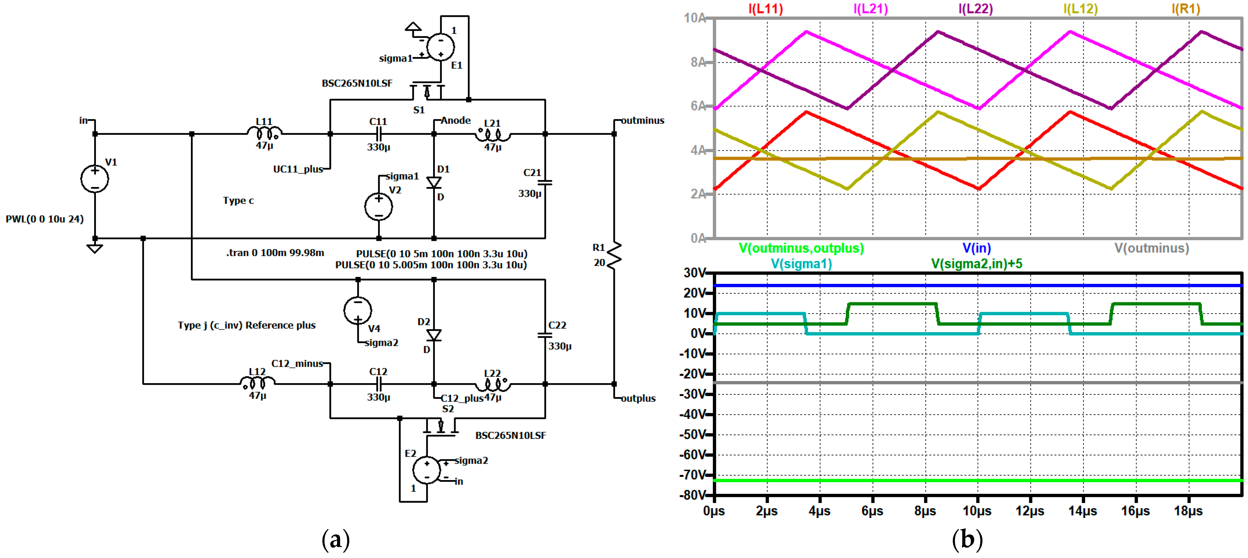 Type IV: (a) Simulation circuit. (b) Top to bottom—current through the second coil (violet); current through the first coil (red); duty cycle (gray); input voltage (blue), output voltage (green).