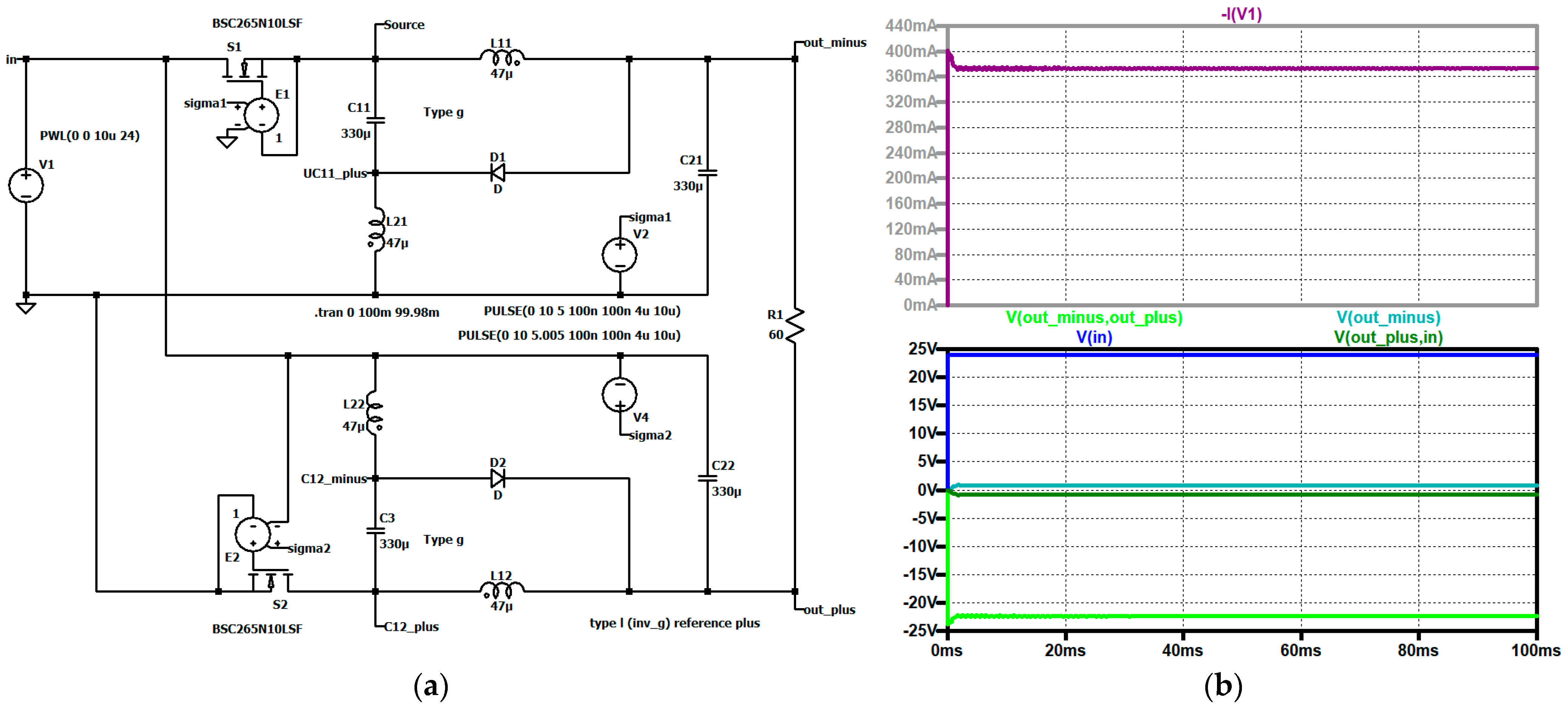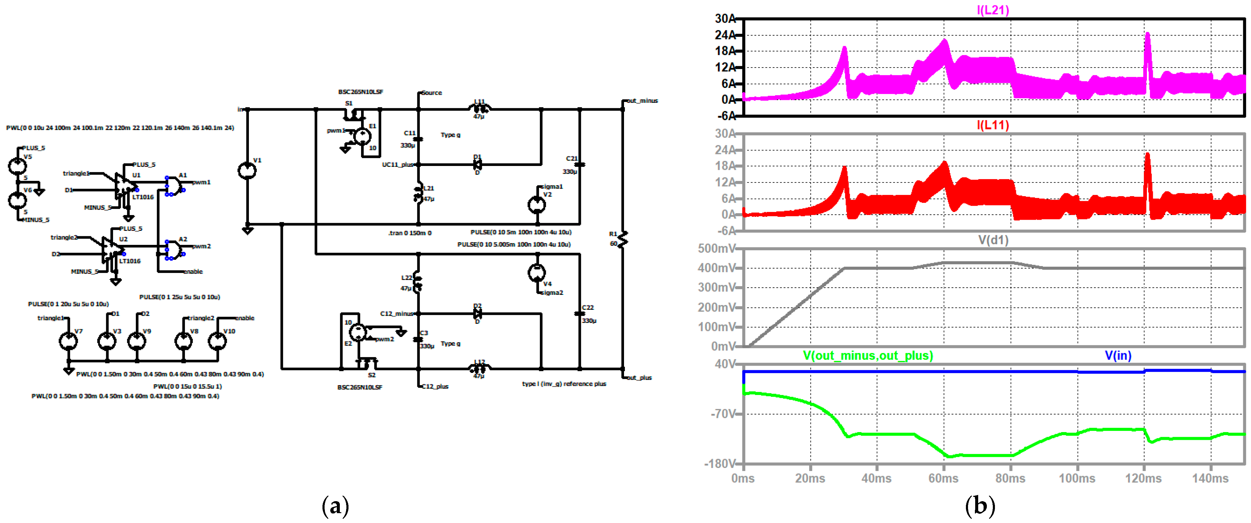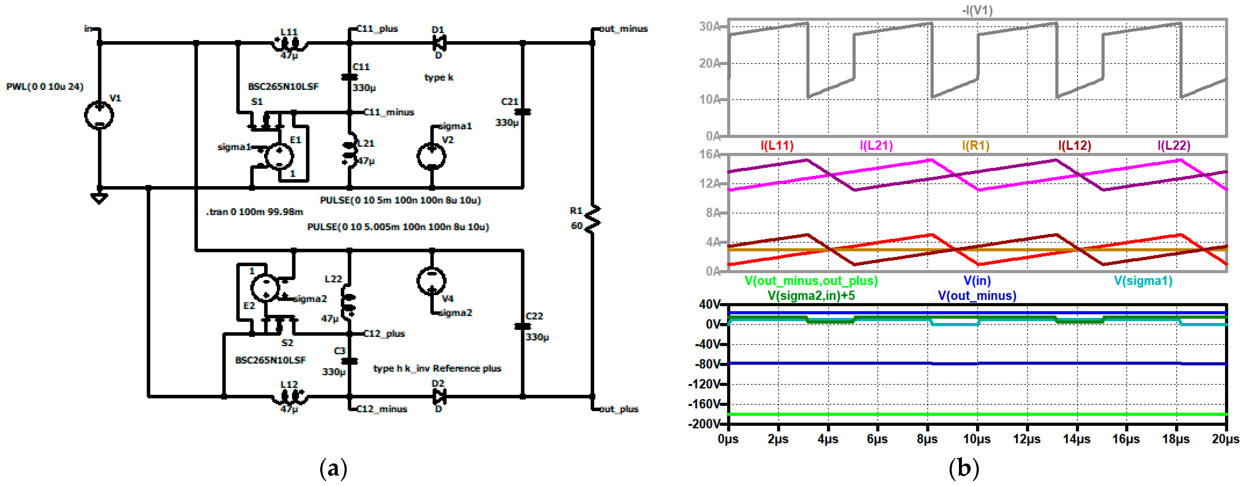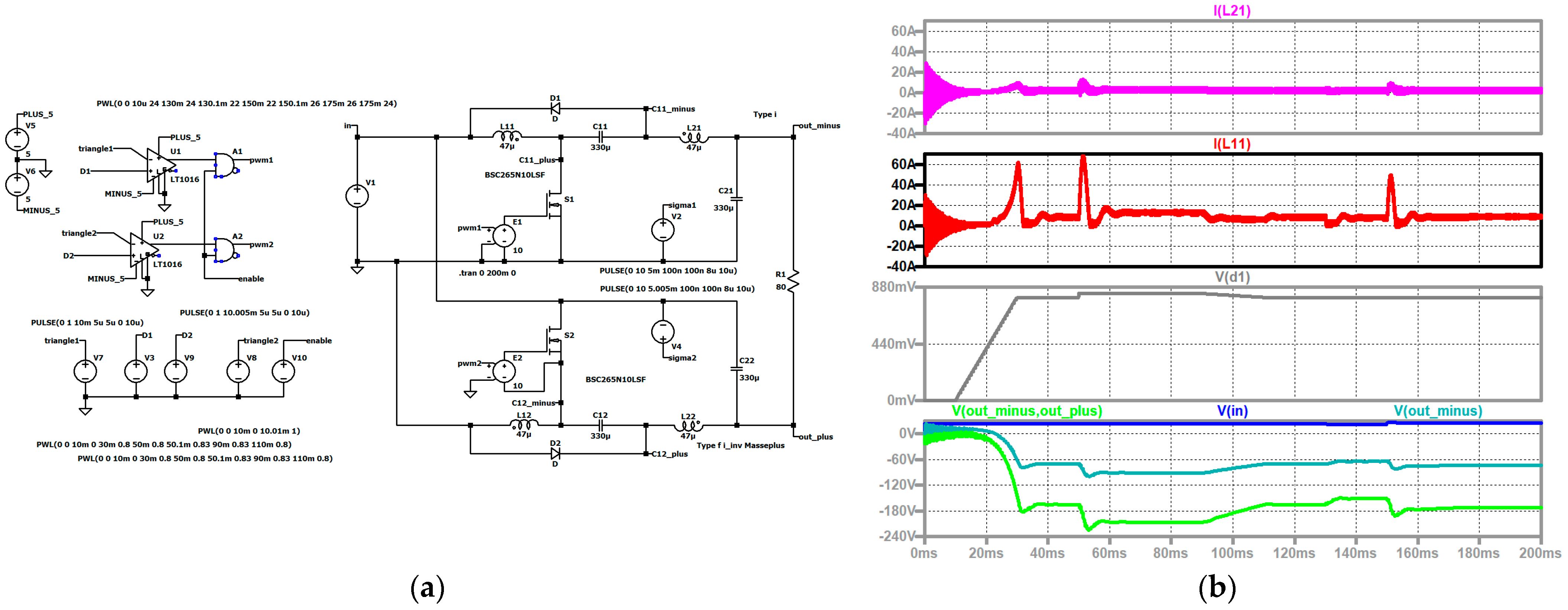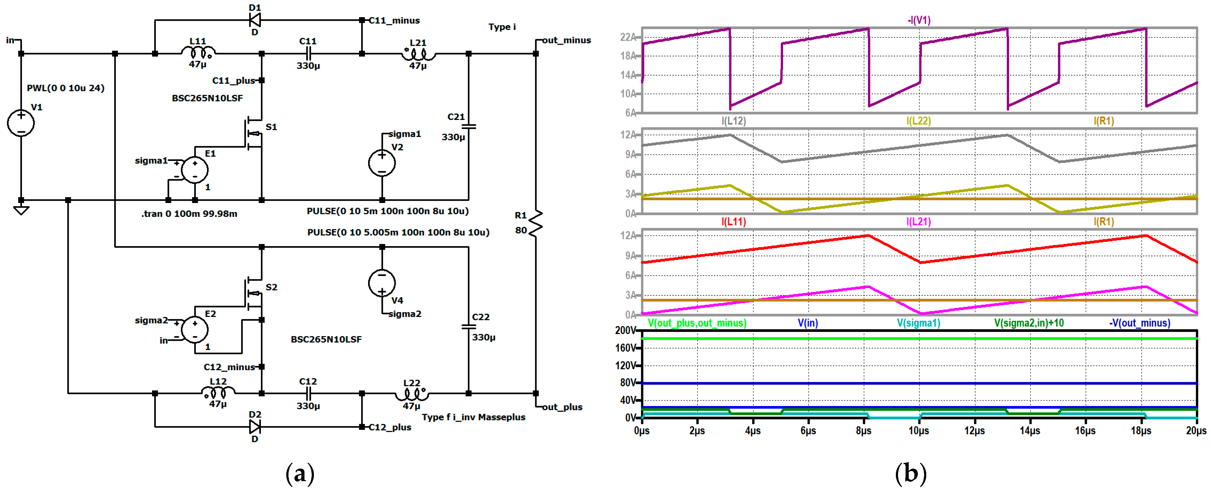 Type IV: (a) Simulation circuit. (b) Top to bottom—current through the second coil (violet); current through the first coil (red); duty cycle (gray); input voltage (blue), output voltage (green).