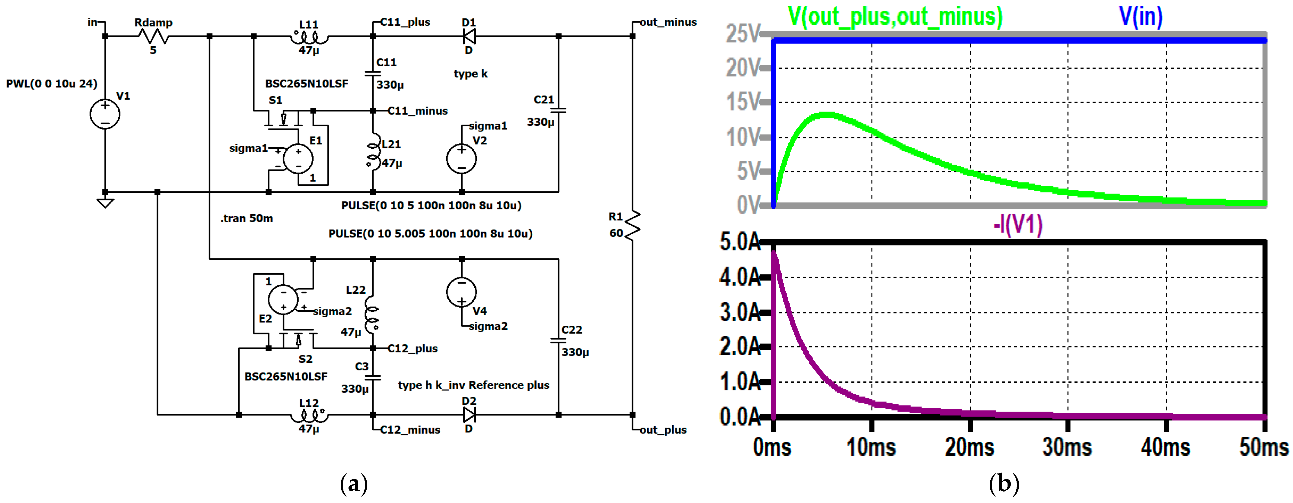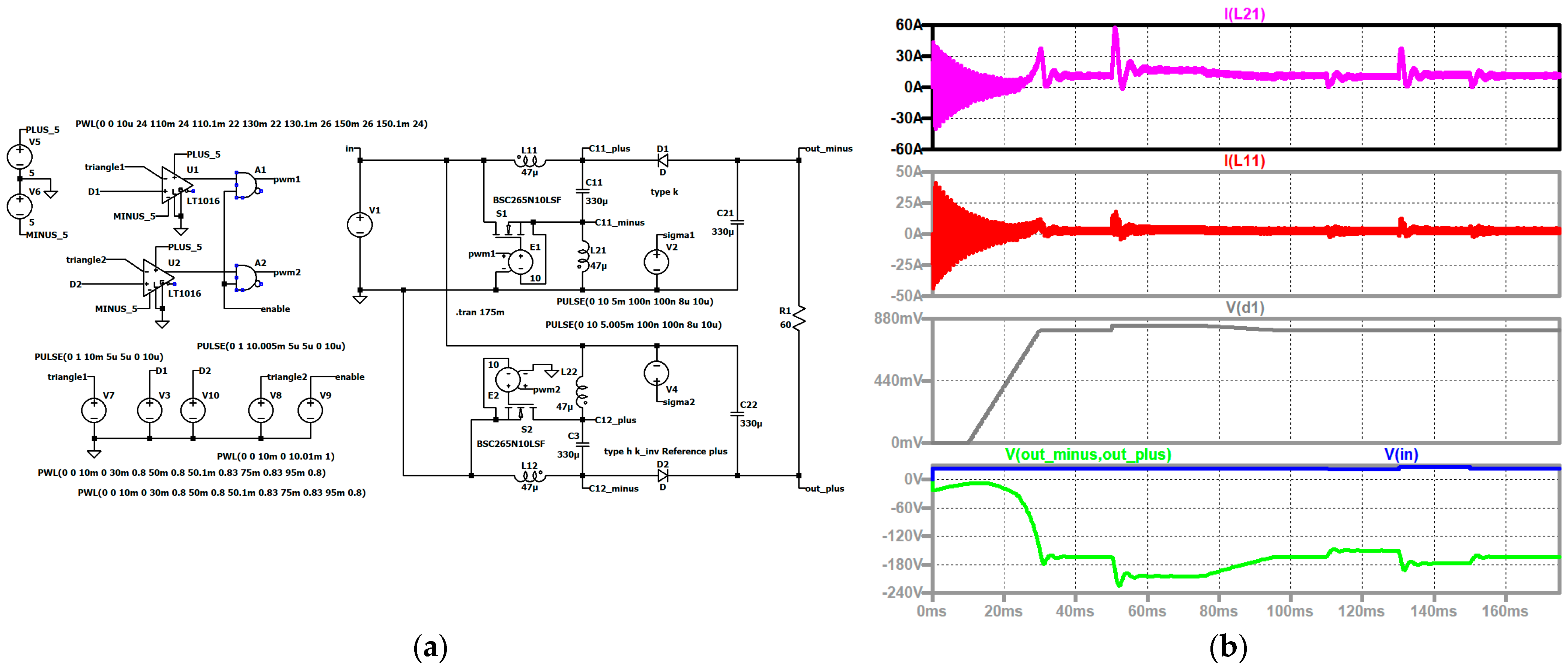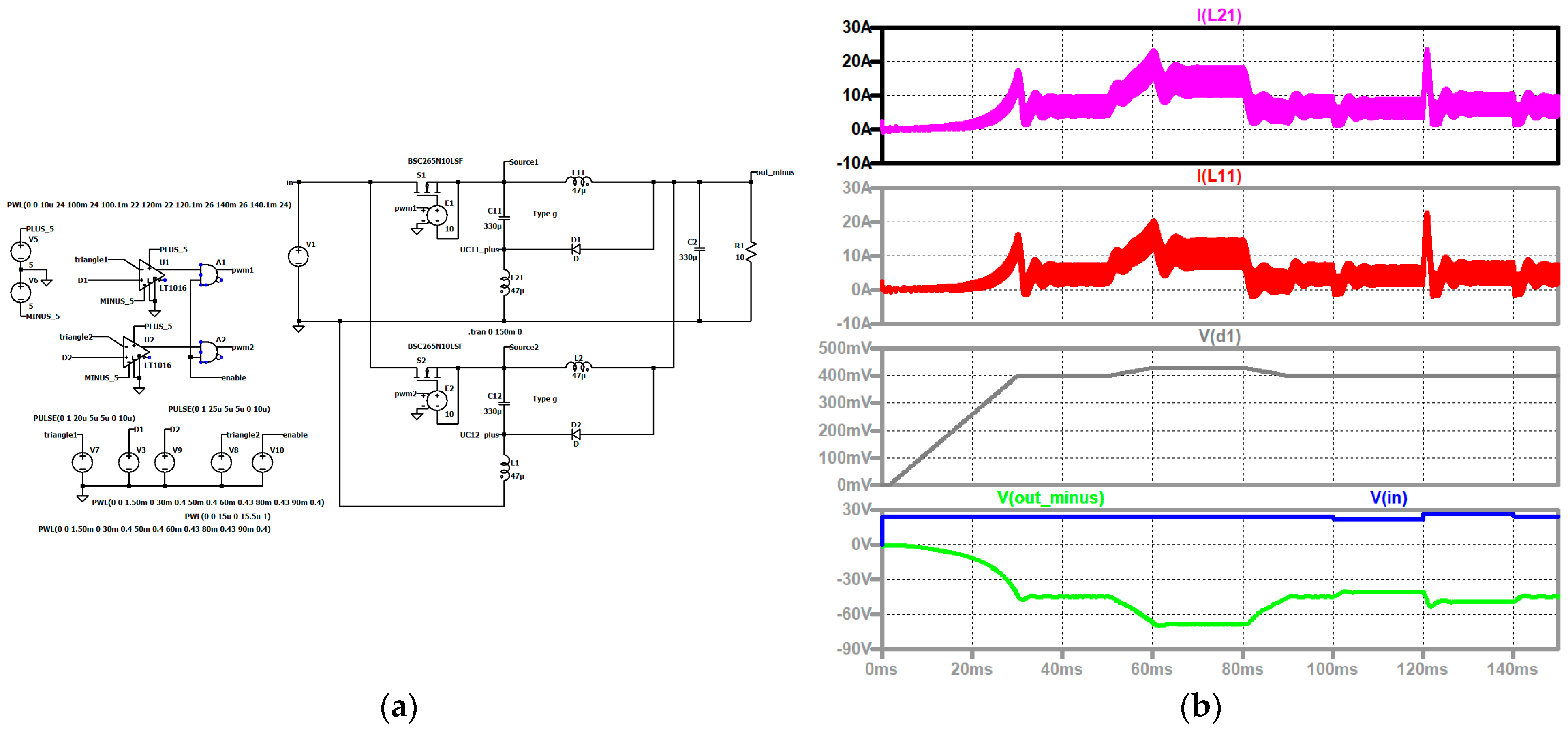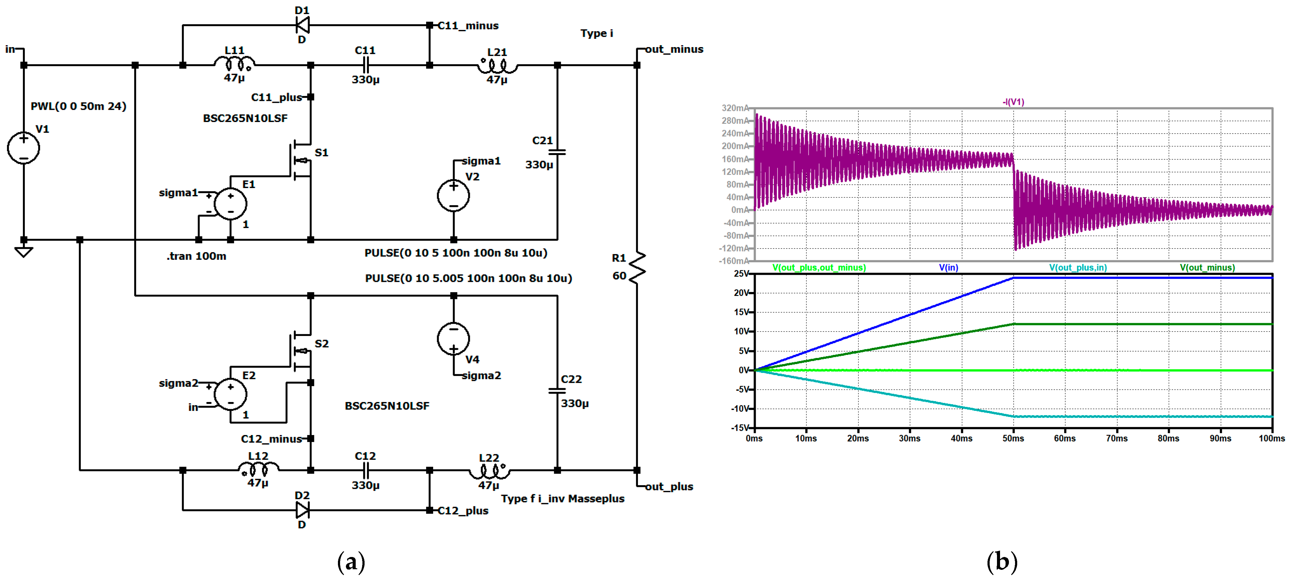 Type IV: (a) Simulation circuit. (b) Top to bottom—current through the second coil (violet); current through the first coil (red); duty cycle (gray); input voltage (blue), output voltage (green).