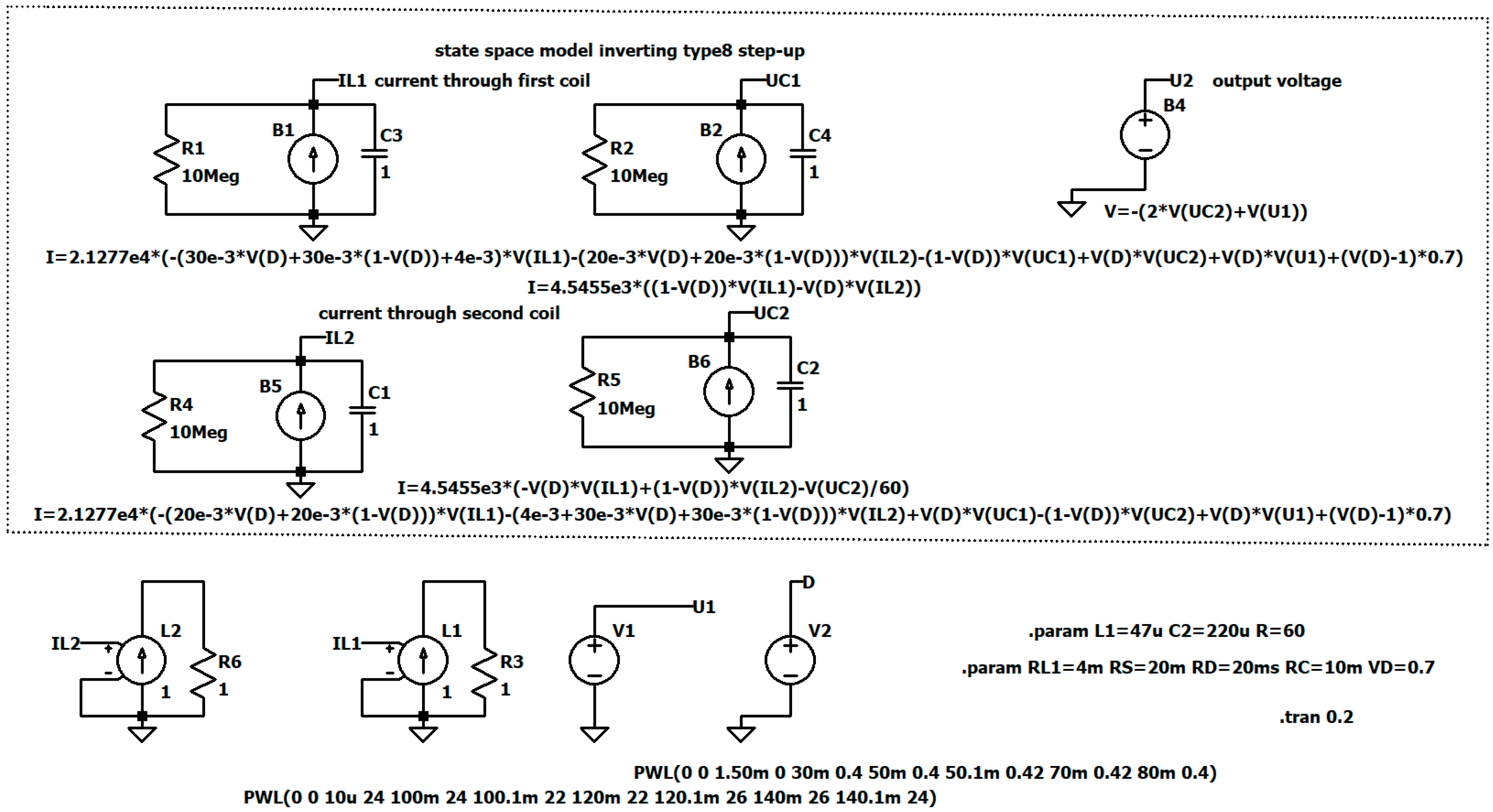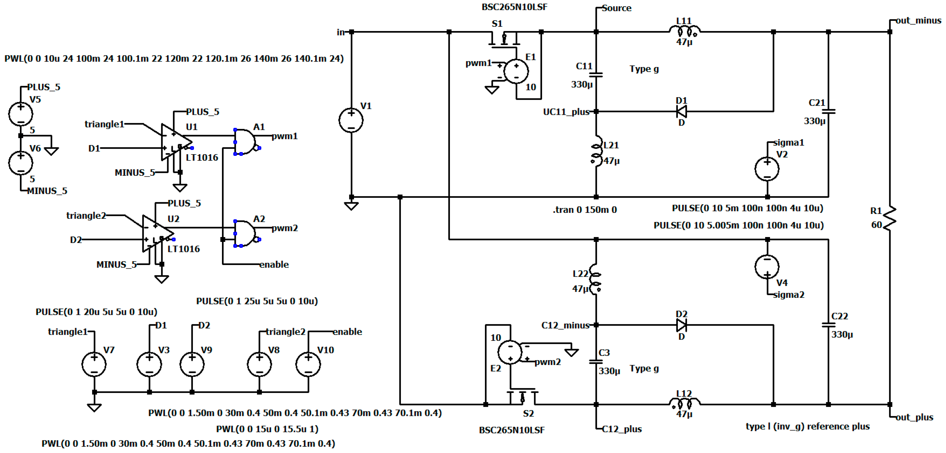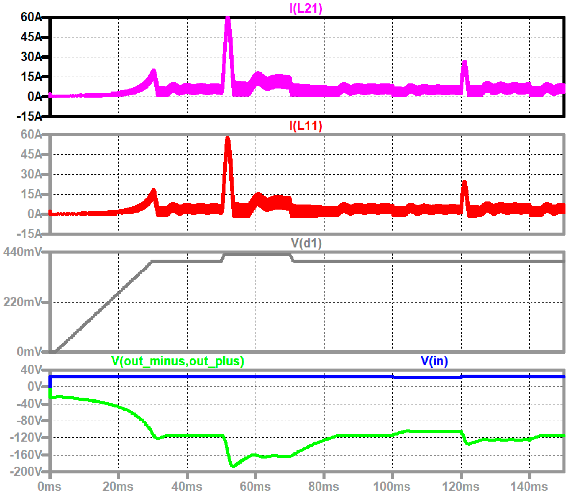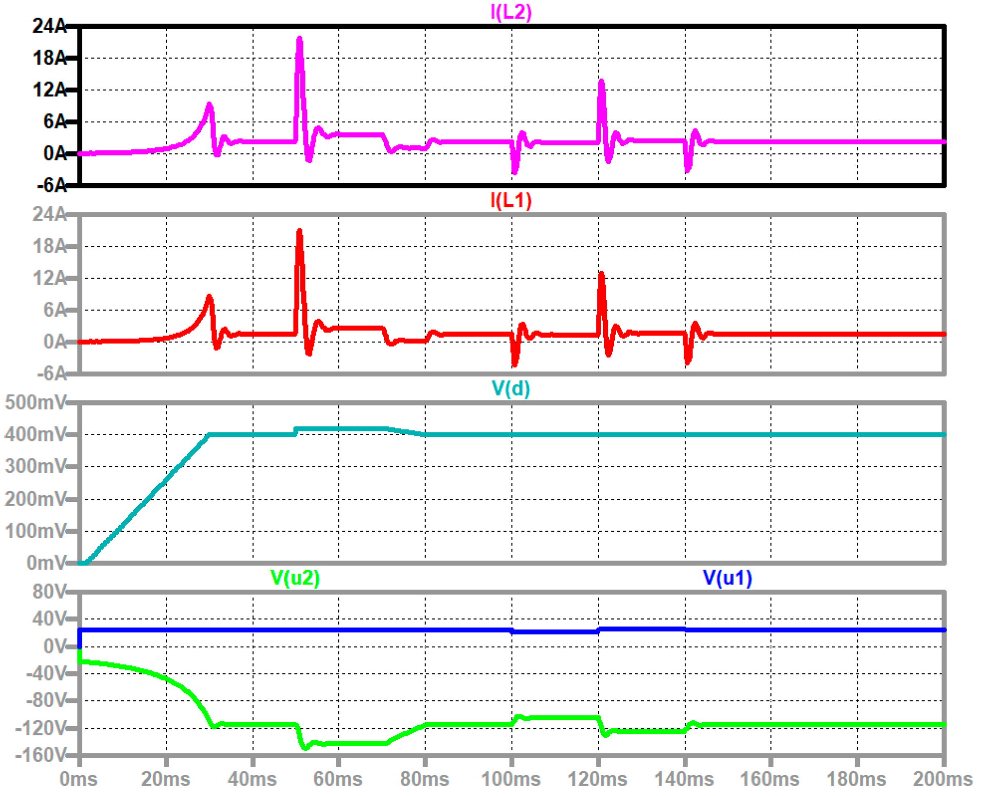 Type IV: (a) Simulation circuit. (b) Top to bottom—current through the second coil (violet); current through the first coil (red); duty cycle (gray); input voltage (blue), output voltage (green).