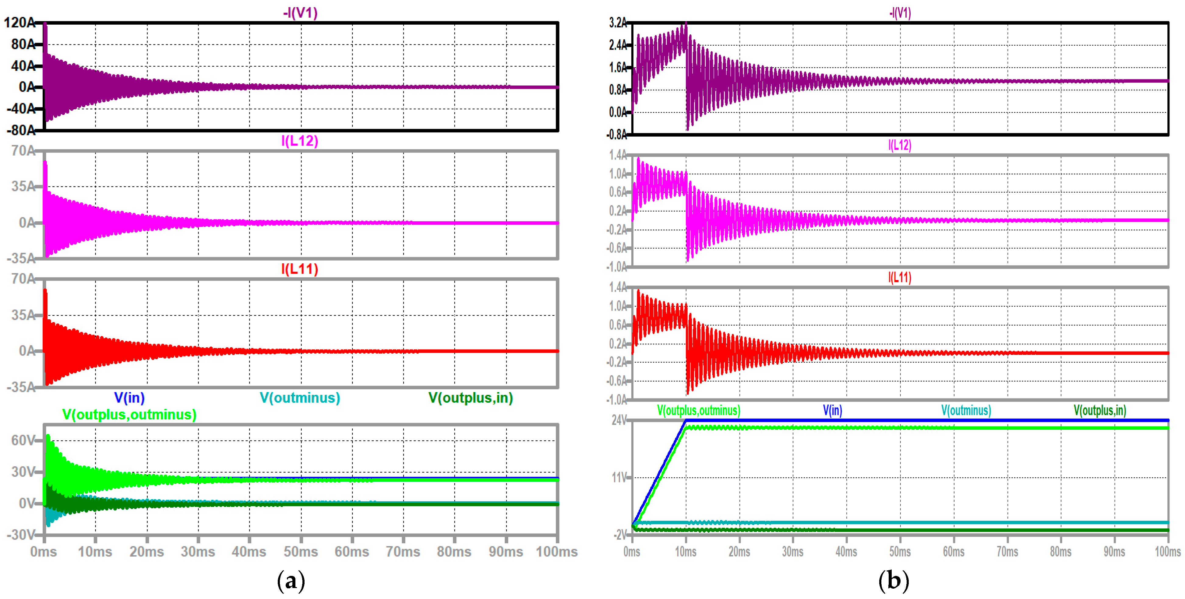 Type II inrush: (a) Top to bottom—input current (dark violet); current through the first coil of stage 2 (violet); current through the first coil of stage 1 (red); output voltage of stage 1 (turquoise), output voltage (green), output voltage of stage 2 (dark green). (b) Top to bottom—input current (dark violet); current through the first coil of stage 2 (violet); current through the first coil of stage 1 (red); input voltage (blue), output voltage (green), output voltage of stage 1 (turquoise), output voltage of stage 2 (dark green).