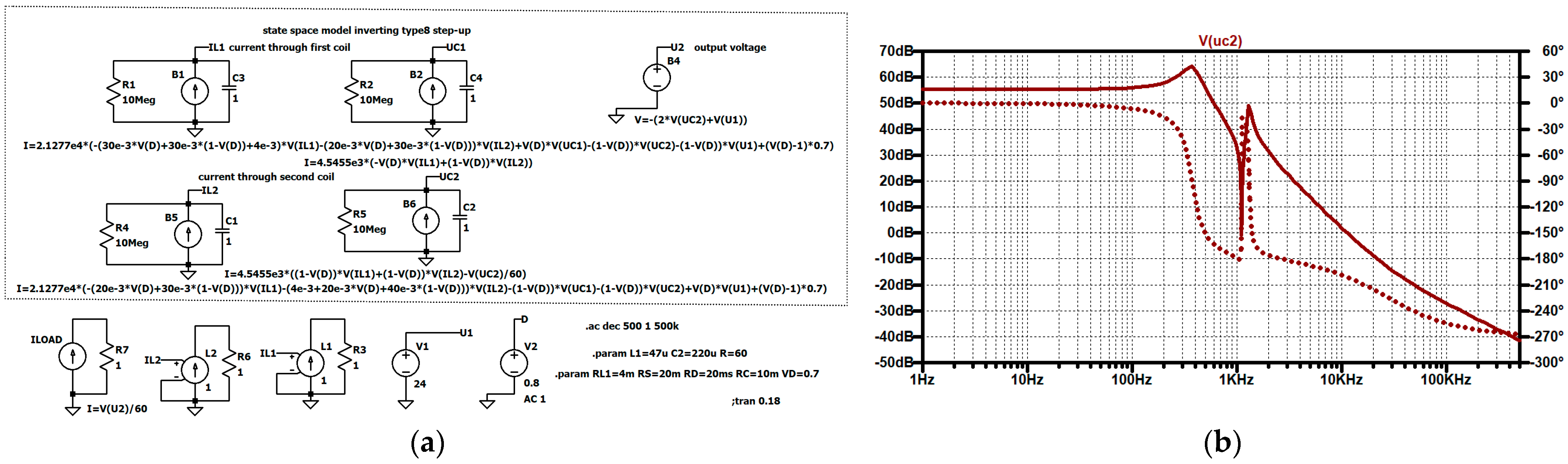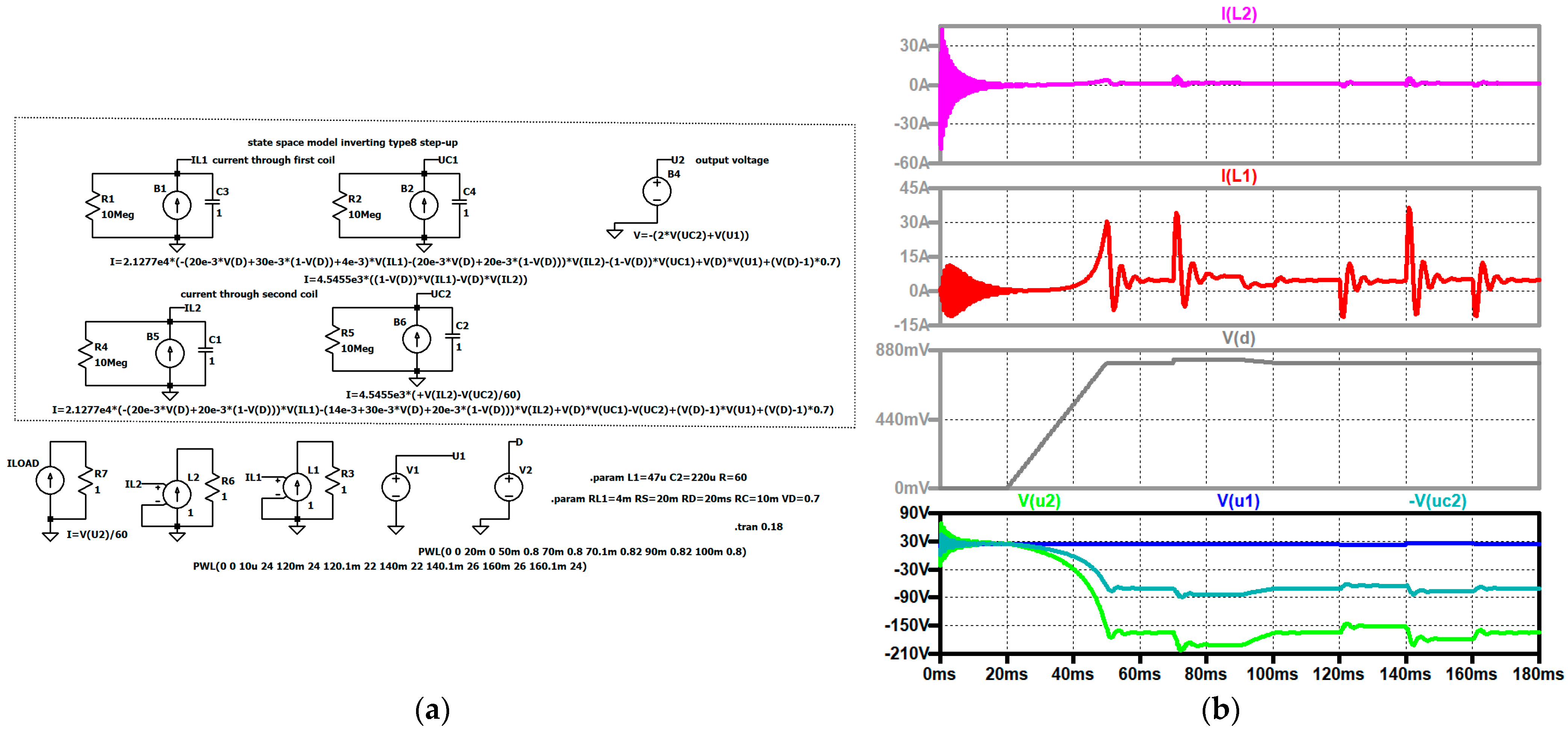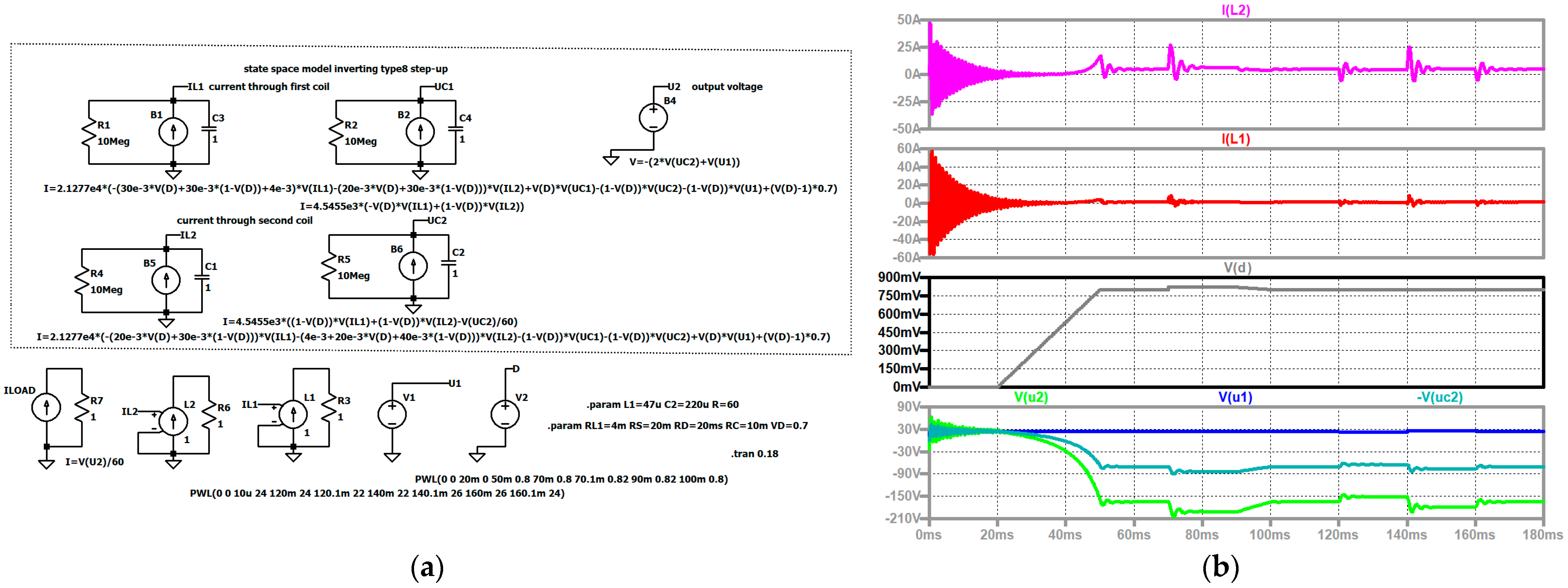 Type III: (a) Simulation circuit. (b) Top to bottom—current through the second coil (violet); current through the first coil (red); duty cycle (gray); input voltage (blue), output voltage of stage 1 (turquoise), output voltage (green).
