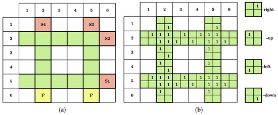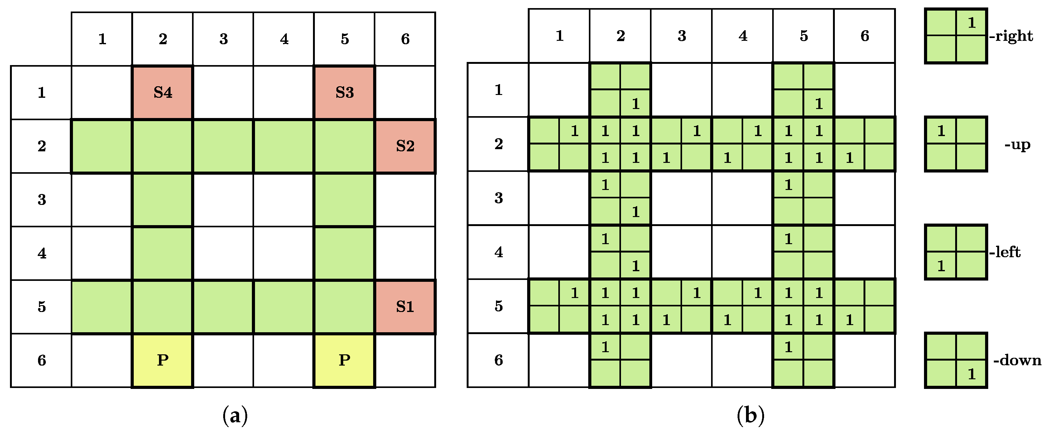 Using a square topology layout, there are four possible movement directions from each square: right, up, left, and down. To fully define the layout, it is necessary to specify all directions in which the robot can exit each square. In Figure 1b, each square is divided into four smaller squares. A value of 1 indicates the possibility of movement in the specified direction, according to the legend on the right side of the figure. In this way, the movement possibilities of the mobile robot can be precisely defined within its environment. This approach allows for the definition of both unidirectional and bidirectional paths. For example, in Figure 1b, the squares (4, 5) and (3, 5) form a unidirectional path (up) and squares (5, 3) and (5, 4) form a bidirectional path (left, right). The practical recording of this data is realized using four mask tables named R, U, L, and D. These correspond to movements to the right, up, left, and down, respectively. If, for example, in the R mask table a given cell has a value of 1, it indicates the possibility for the mobile robot to move from this square to the right, to the neighboring square. The method described above for defining the transport environment for mobile robots as a square topology will be used in the Section 4 to present a test case for the simulation experiment.