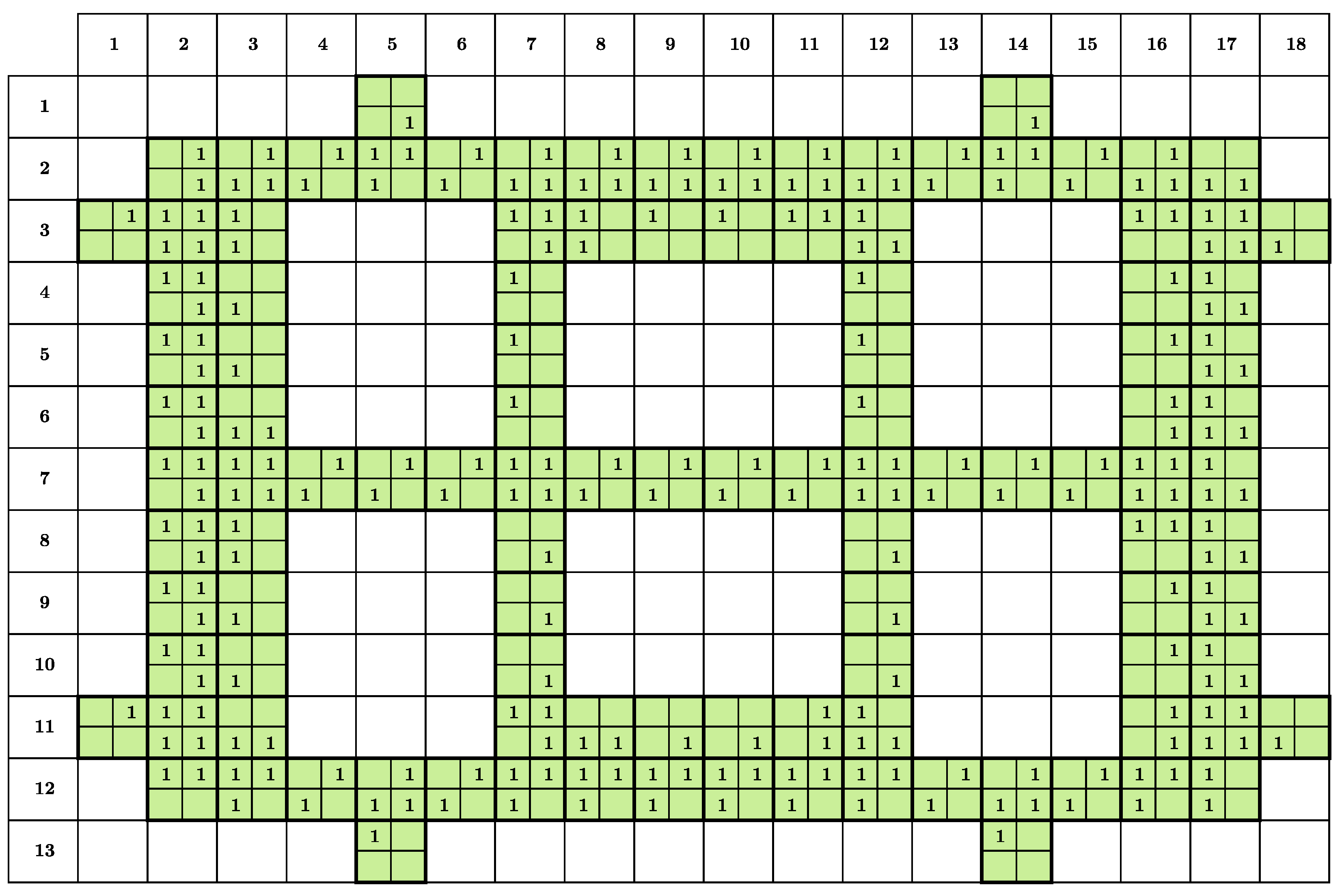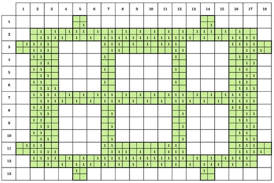 Figure 3 presents a discretized test layout with 13 rows and 18 columns. Inside each square, there can be up to four instances of the digit “1.” According to the legend below the figure, the value “1” indicates that AGVs can move in the corresponding direction. These data are stored in the R, U, L, and D mask tables. Squares with a green background represent transport routes accessible to AGVs. The presented layout serves as the foundation for building a simulation model of a production system that utilizes a transportation system with multiple AGVs.
