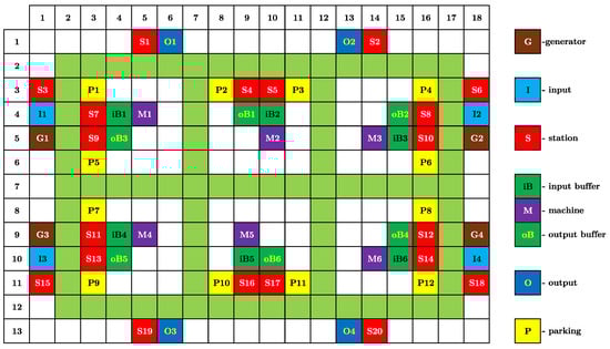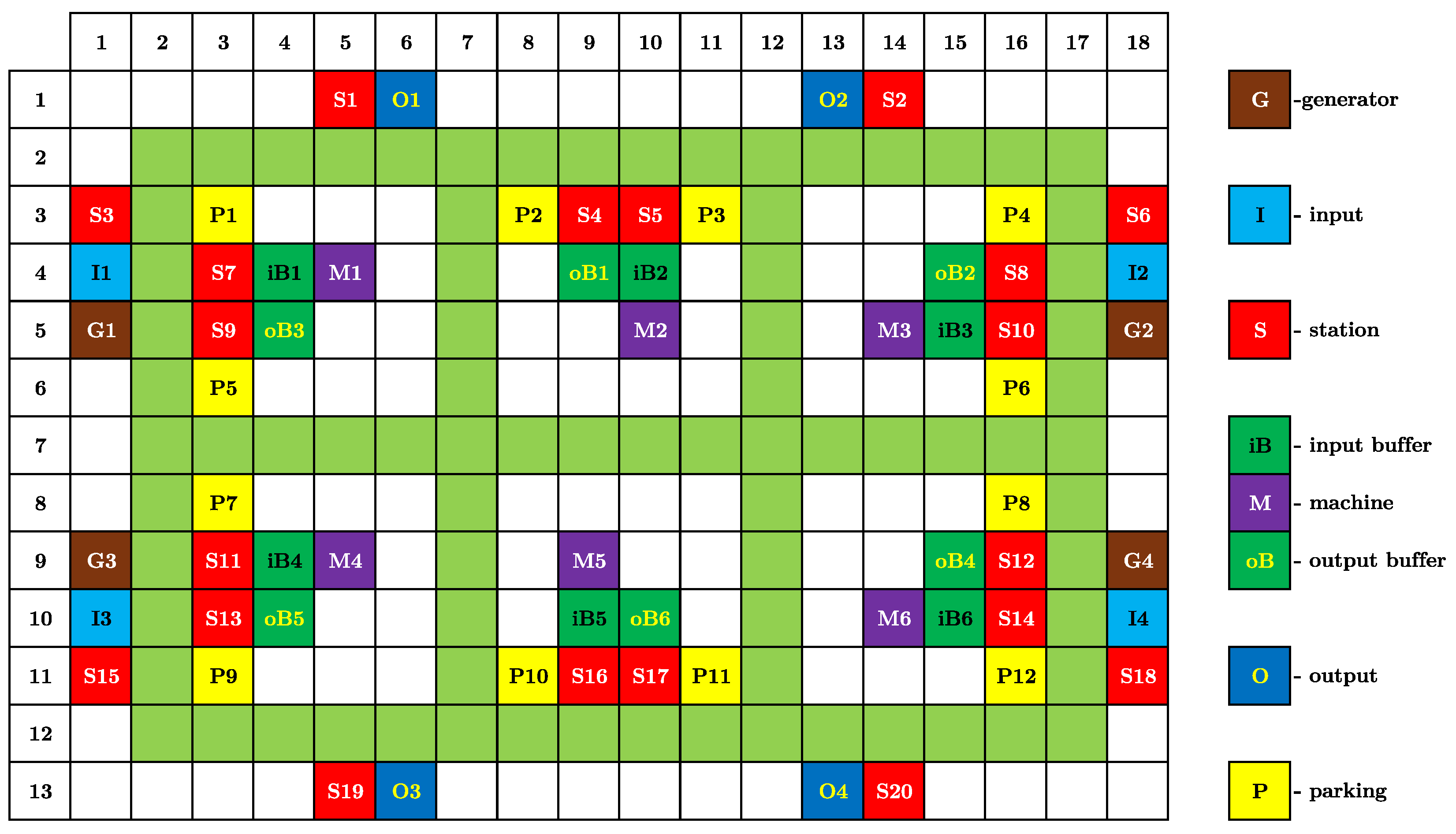 The system contains workpiece generators (“G”), from which items are sent to input buffers (“I”). Stations (“S”) are locations where mobile robots stop to load or unload a workpiece. The production system includes six machines (“M”), each equipped with input buffer (“iB”) and output buffer (“oB”). After the production process is completed, the workpieces are transported to the appropriate output (“O”). Parking spaces for mobile robots are marked as (“P”). Each parking space is equipped with a battery charging station.