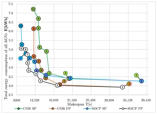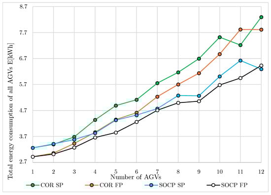 As mentioned in previous chapters, the effective use of AGV-based transportation systems is influenced by many factors. Therefore, a multi-criteria approach should be used to evaluate them. The most commonly used evaluation criteria are the time taken to complete transportation tasks (makespan); energy consumption, which affects the operational cost of completing these tasks; and utilization rate of AGVs. Of the five essential tasks related to AGV systems presented in the article [], this paper focuses on the tasks of path planning and motion planning. The importance of these two areas is particularly significant when the transport path network is not “by design” collision and deadlock free. In this case, it is necessary to apply appropriate methods that provide efficient path planning and collision and deadlock free control of the AGV system. Considering these factors, the article presents research on the impact of AGV deadlock handling and path planning methods on makespan, AGV energy consumption and AGV utilization.