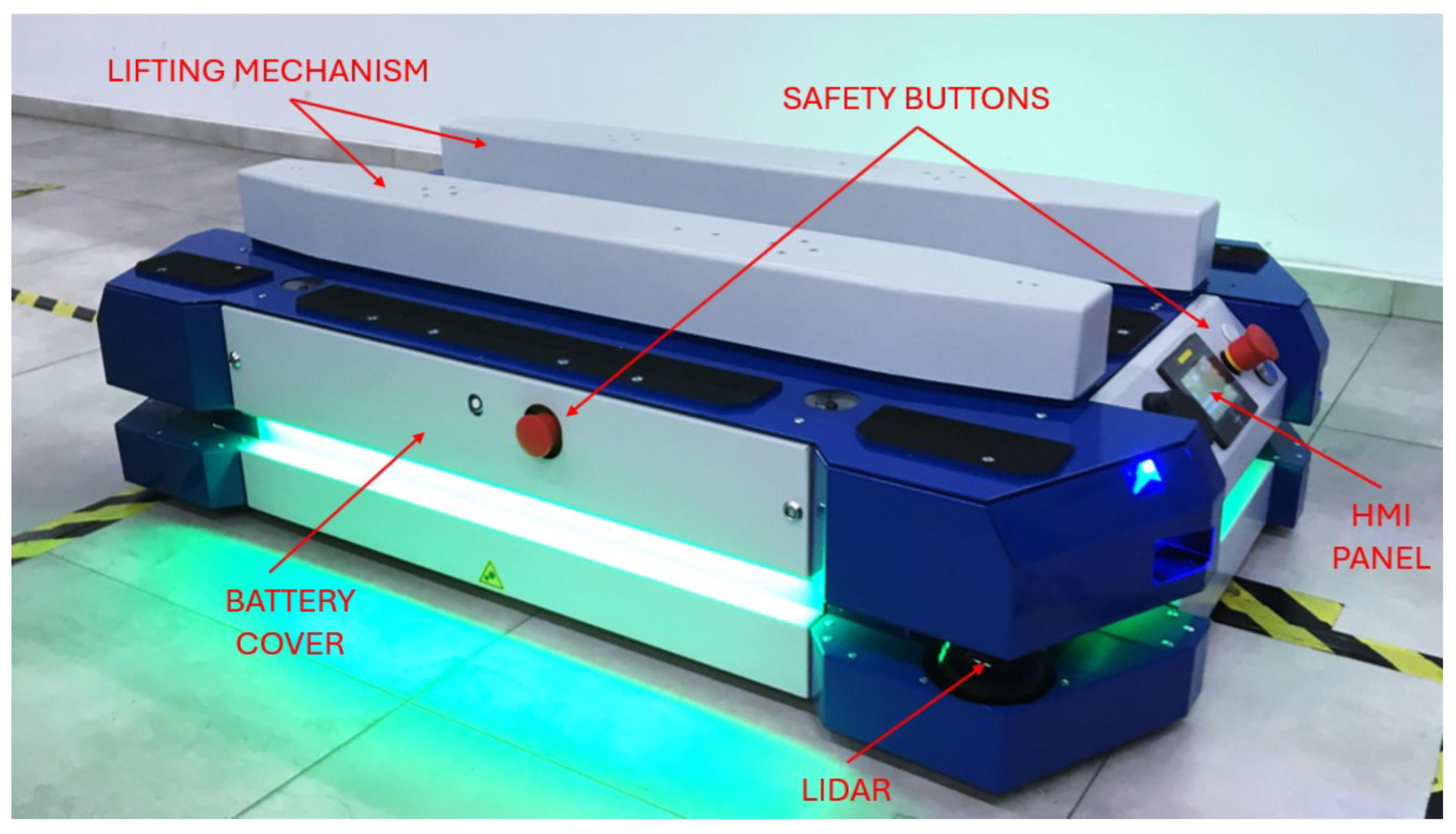 To build a simulation model for studying the energy consumption of AGVs, it is necessary to determine their functional parameters, particularly their energy consumption in different operating states. These parameters were determined based on measurements taken from a real mobile robot, shown in Figure 2.