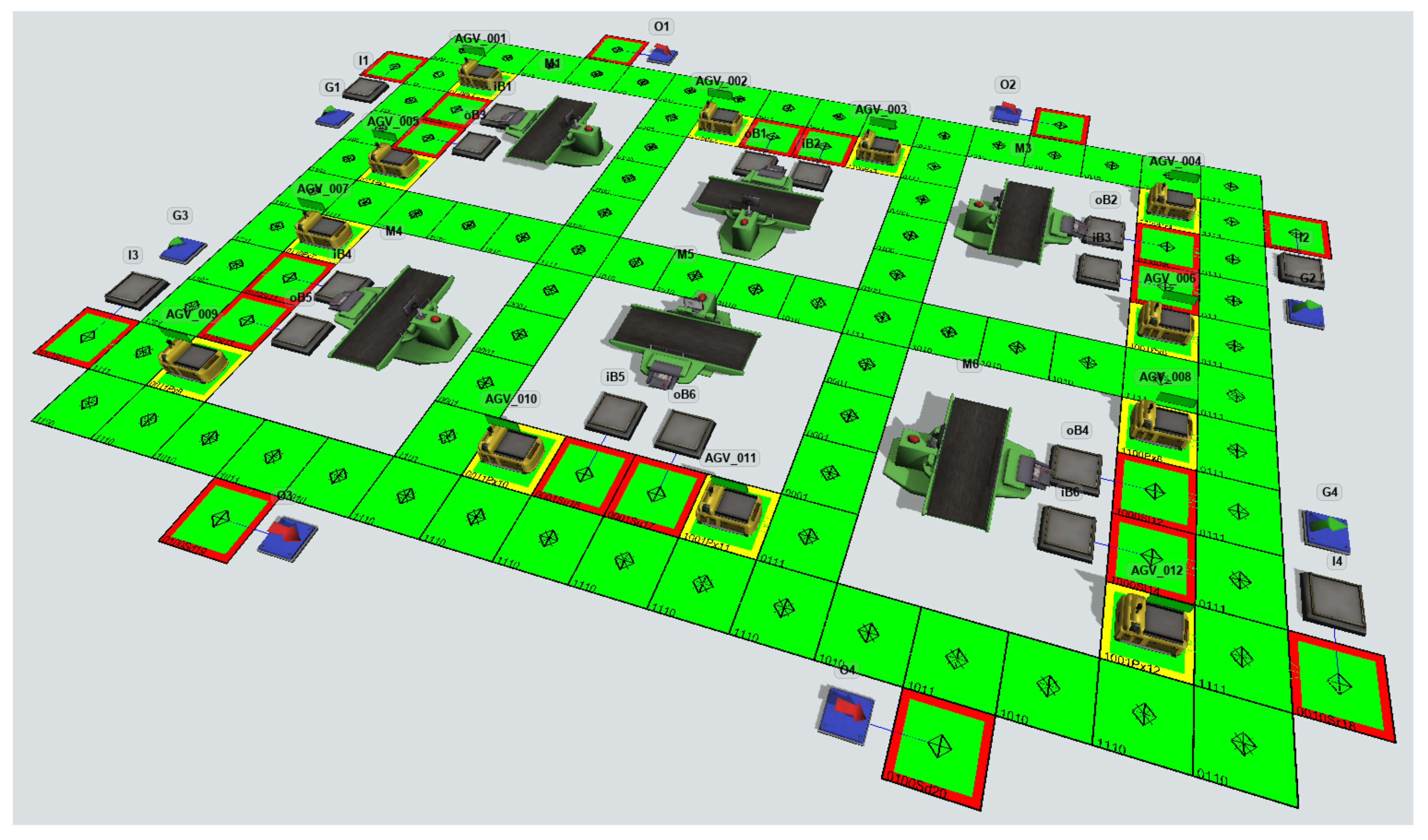 Based on the layout described above, a simulation model was built in FlexSim, as shown in Figure 5. Squares corresponding to the stations are marked with red frames, and parking places are marked with yellow frames. In this model, up to 12 AGVs can be used to perform transportation tasks. The AGV parameters were determined based on the characteristics and test results of a real mobile robot. The robot’s linear-motion kinematics follow a trapezoidal profile consisting of three stages: acceleration to the maximum attainable speed, travel at constant (crusing) speed, and deceleration at a constant rate. The simulation model omits robot docking as well as load lifting and lowering, since these activities are repetitive in every simulation scenario. Additionally, the loading and unloading time for each workpiece was set to 5 s. Angular acceleration and deceleration were omitted due to limitations of the simulation tool. Each robot is also equipped with a flag that visualizes the battery’s energy level.