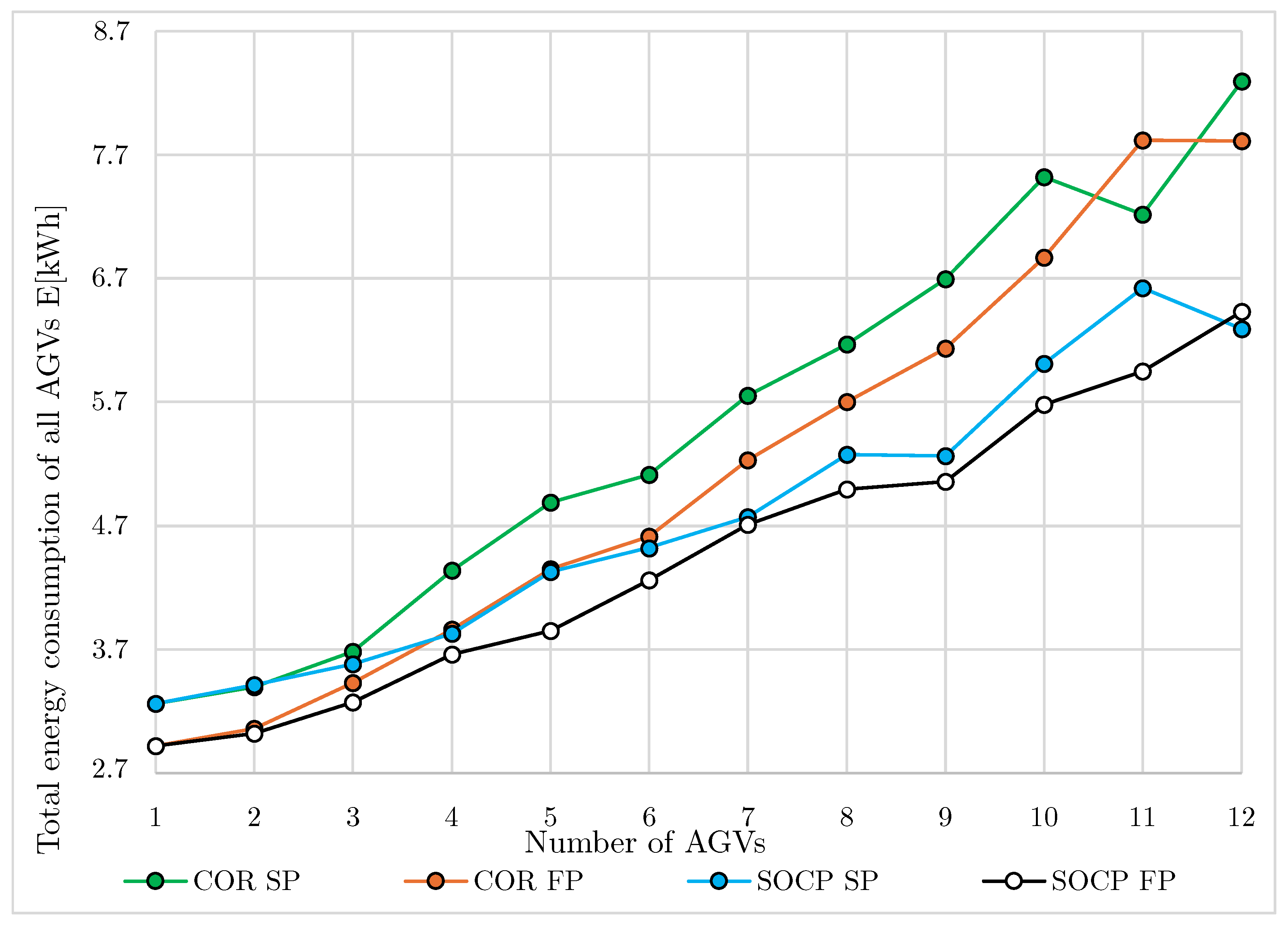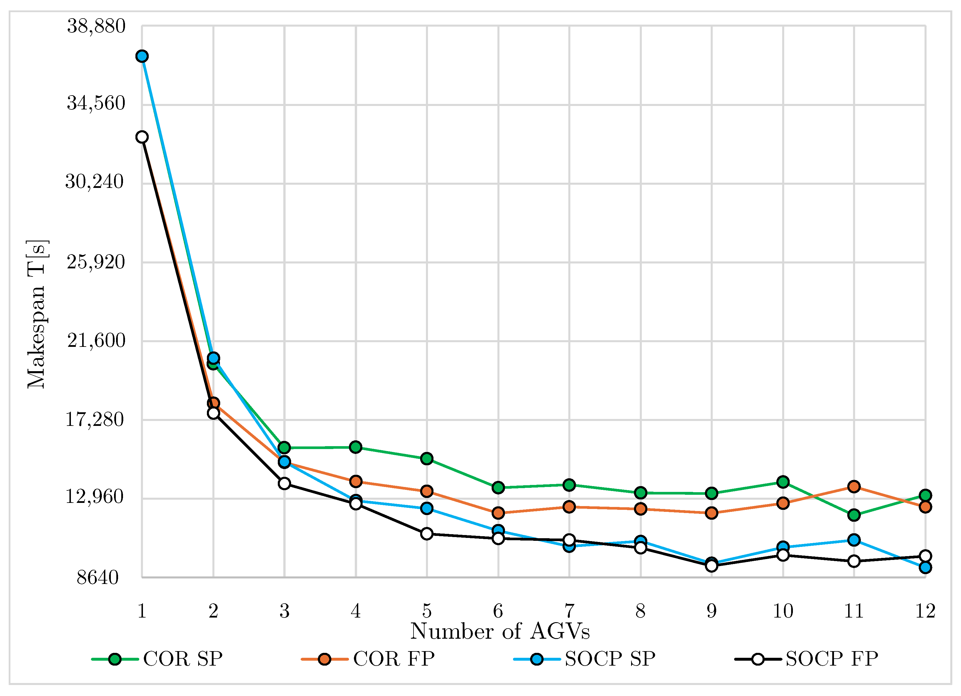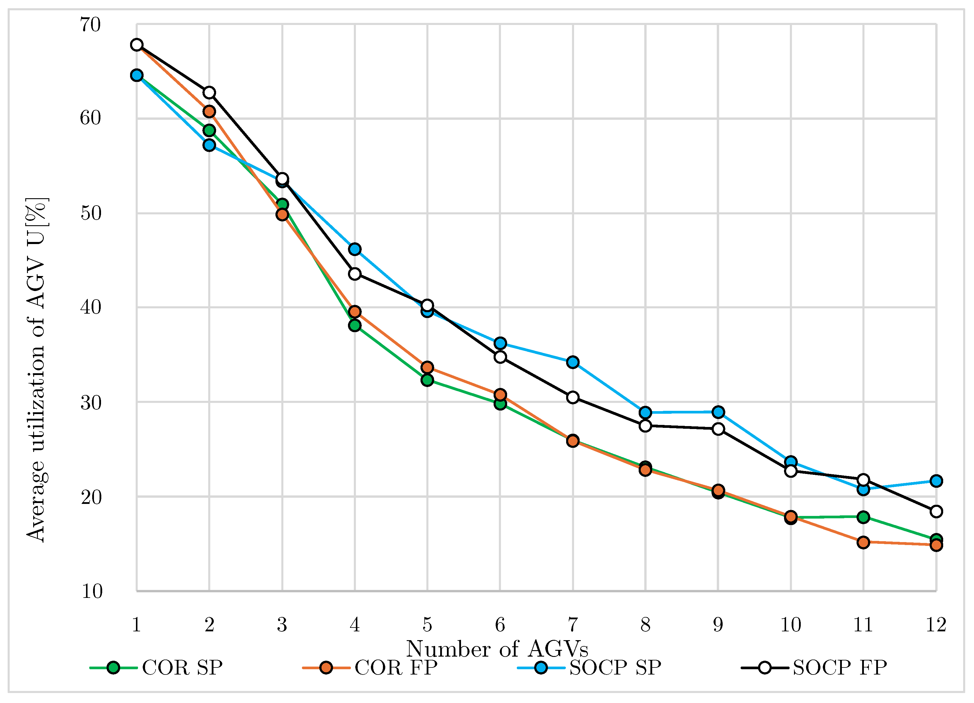 During the simulation, a new travel path is generated for each AGV immediately before it begins a transport task. The generated route depends on the robot’s current position as well as the pickup and drop-off locations associated with the task. In the simulation experiments, one of the two path-generation algorithms (SP or FP) is selected first, and one of the two deadlock-prevention methods (COR or SOCP) is applied. For each such configuration, simulation experiments is performed with the number of AGVs ranging from 1 to 12.