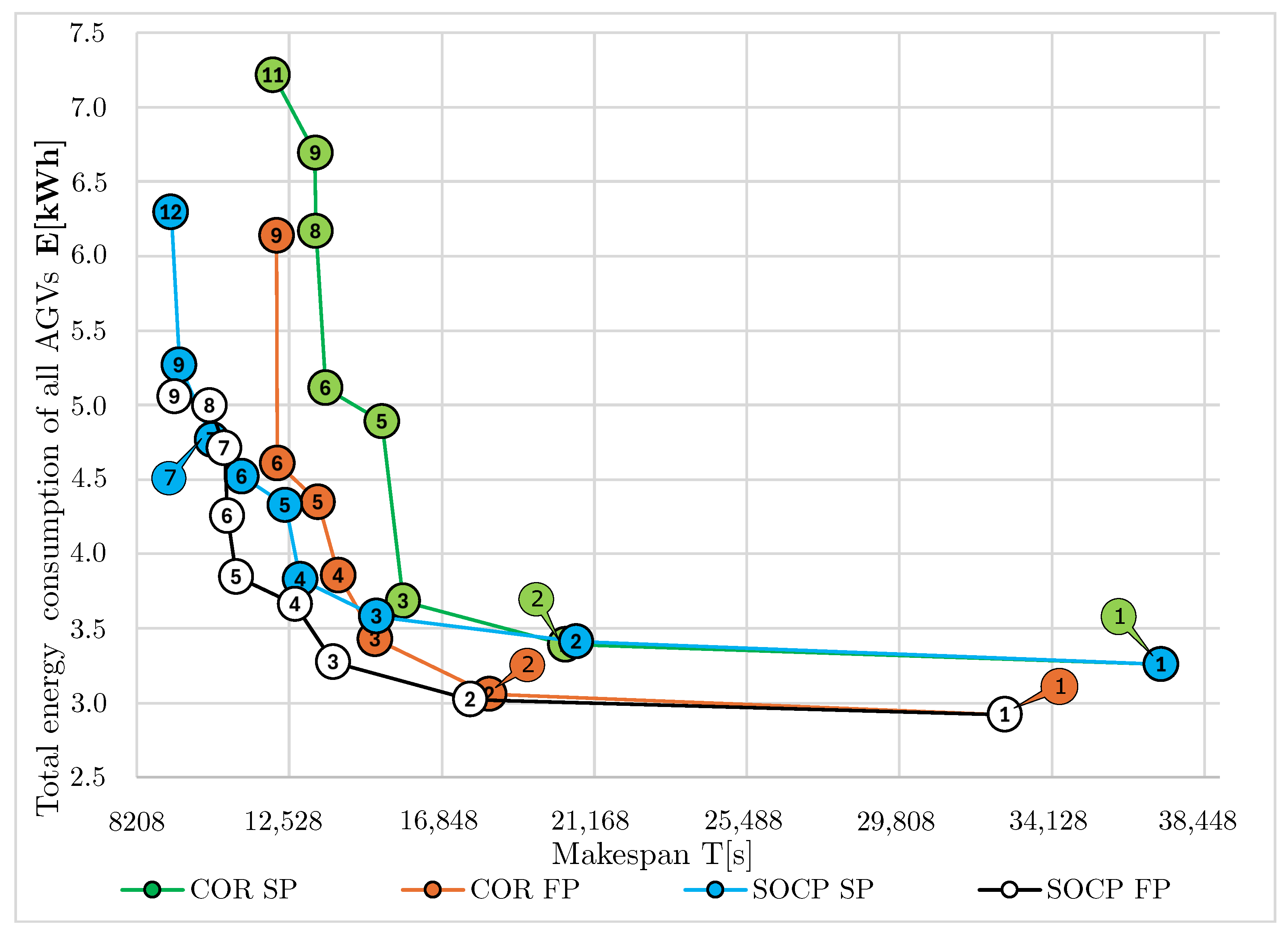 Therefore, it is necessary to consider the possibility of deadlocks in the system and apply an appropriate method to eliminate them. To the authors’ knowledge, existing scientific literature has not sufficiently addressed the impact of deadlock handling methods on energy consumption, transportation task timing, and AGV utilization in production systems. This problem poses a challenge, i.e., a research gap, which is why this study focuses on this issue. This paper addresses the original research problem of studying the impact of deadlock handling methods on the multi-criteria optimization of transport system control with multiple AGVs. Two methods are used as examples: the Chain of Reservation and the Structural Online Control Policy. These methods are briefly described in Section 3 and in more detail in [57,58]. The criteria used are the energy consumption of all AGVs and the time needed to complete all tasks (makespan). All energy consumption data were obtained from tests conducted on a real AGV. Additionally, two methods were used to generate paths: Shortest Path (SP) and Fastest Path (FP). Both are based on the Breadth-First Search (BFS) algorithm and are described in Section 3. All four methods were implemented and used to simulate the control of a multi-AGV system in a square topology environment. That allowed for the analysis of the research results and the formulation of final conclusions.