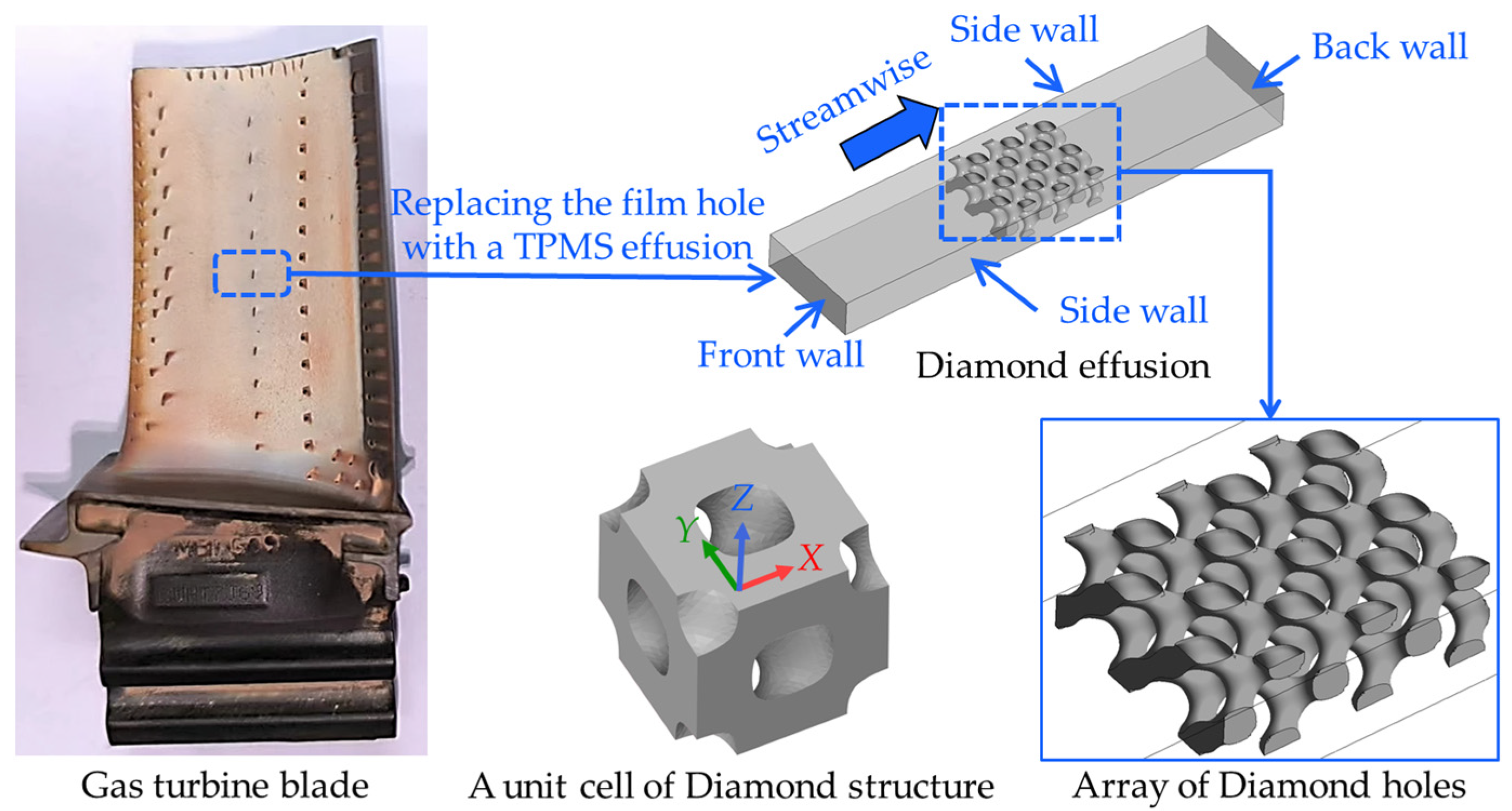 - Wang, W.; Yan, Y.; Zhou, Y.; Cui, J. Review of Advanced Effusive Cooling for Gas Turbine Blades. Energies 2022, 15, 8568. [Google Scholar] [CrossRef]