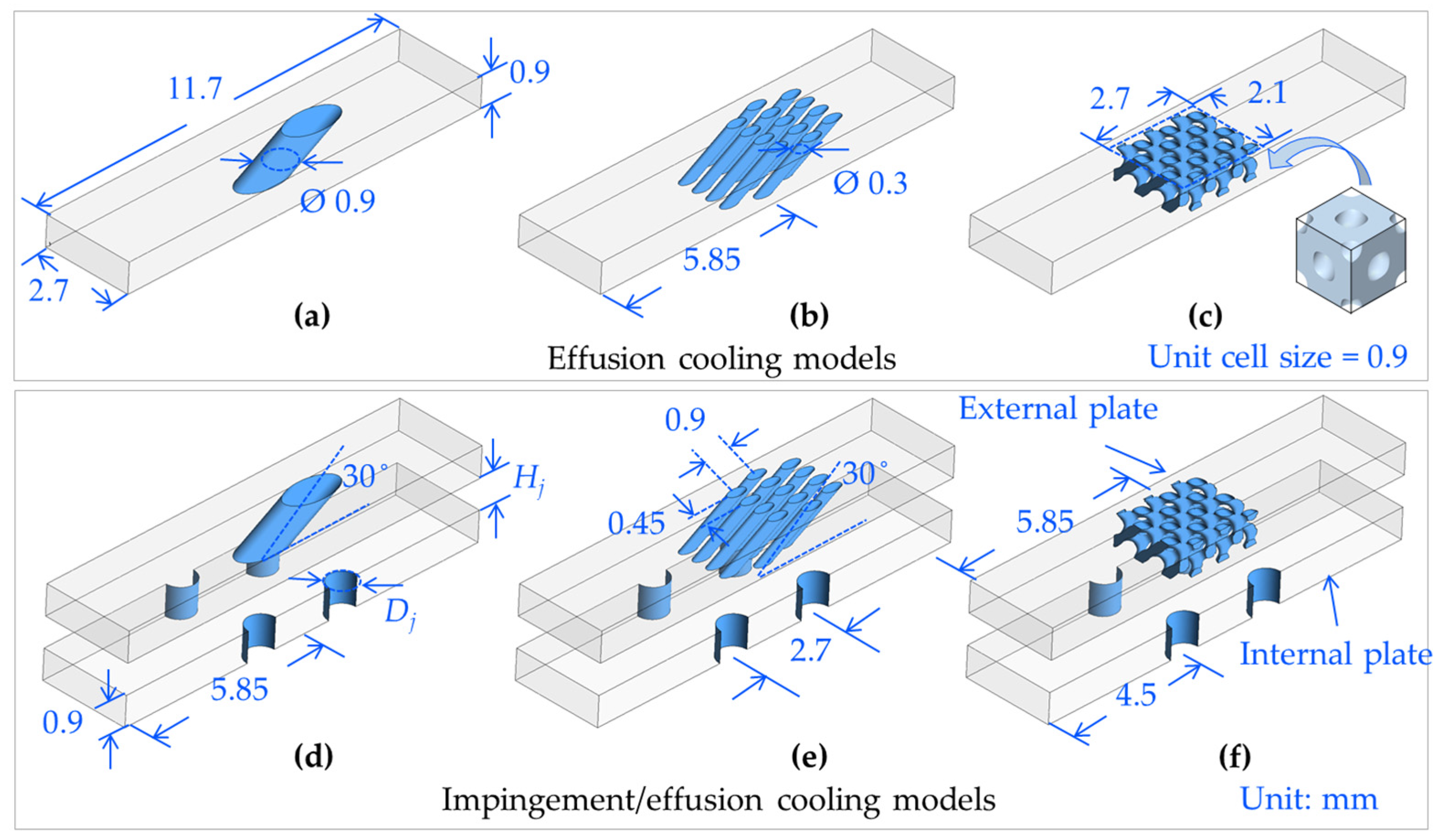 | Models | Details of the Effusion Cooling | Discharge Area (mm2) | In-Hole Area (mm2) | Porosity (%) |