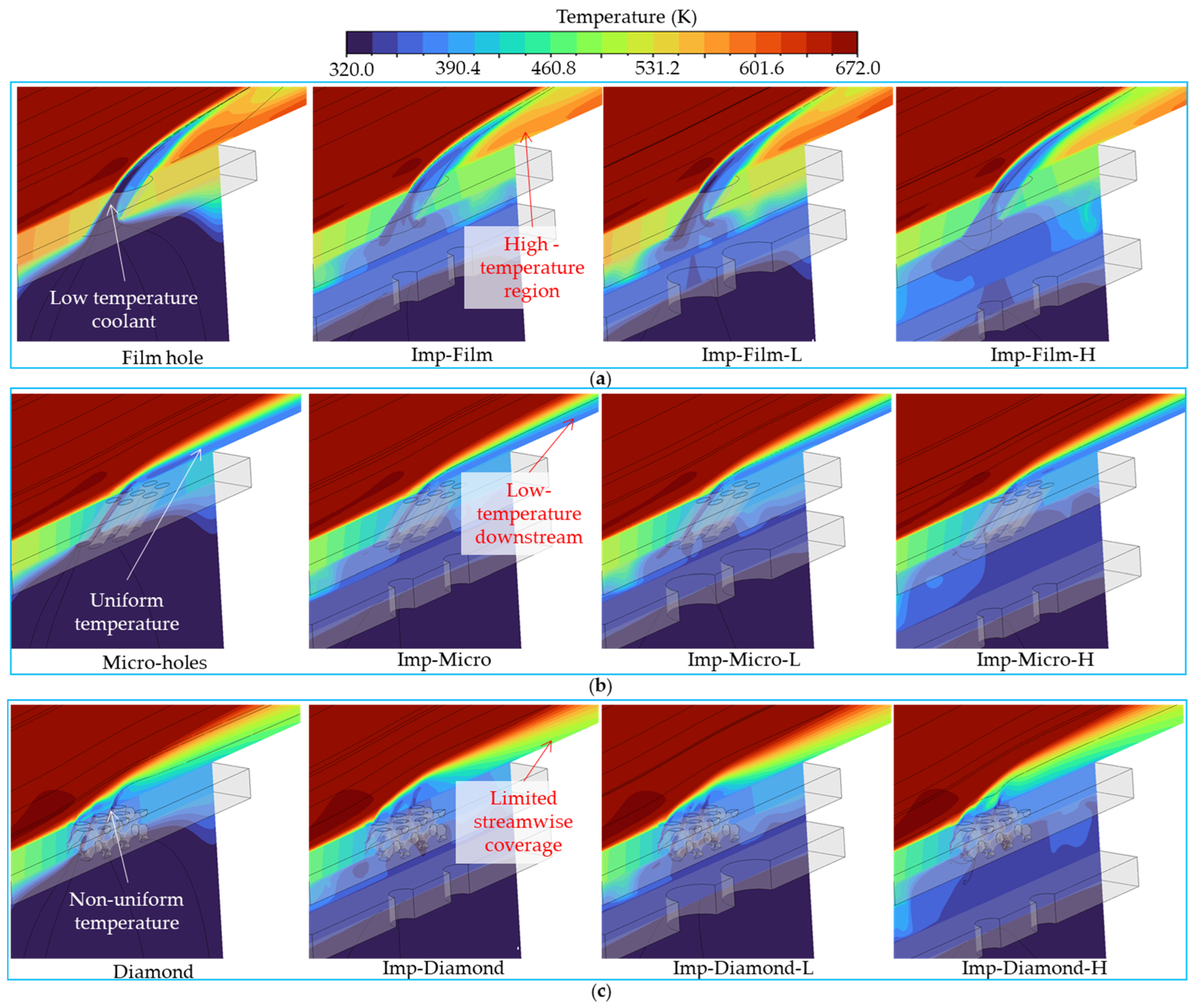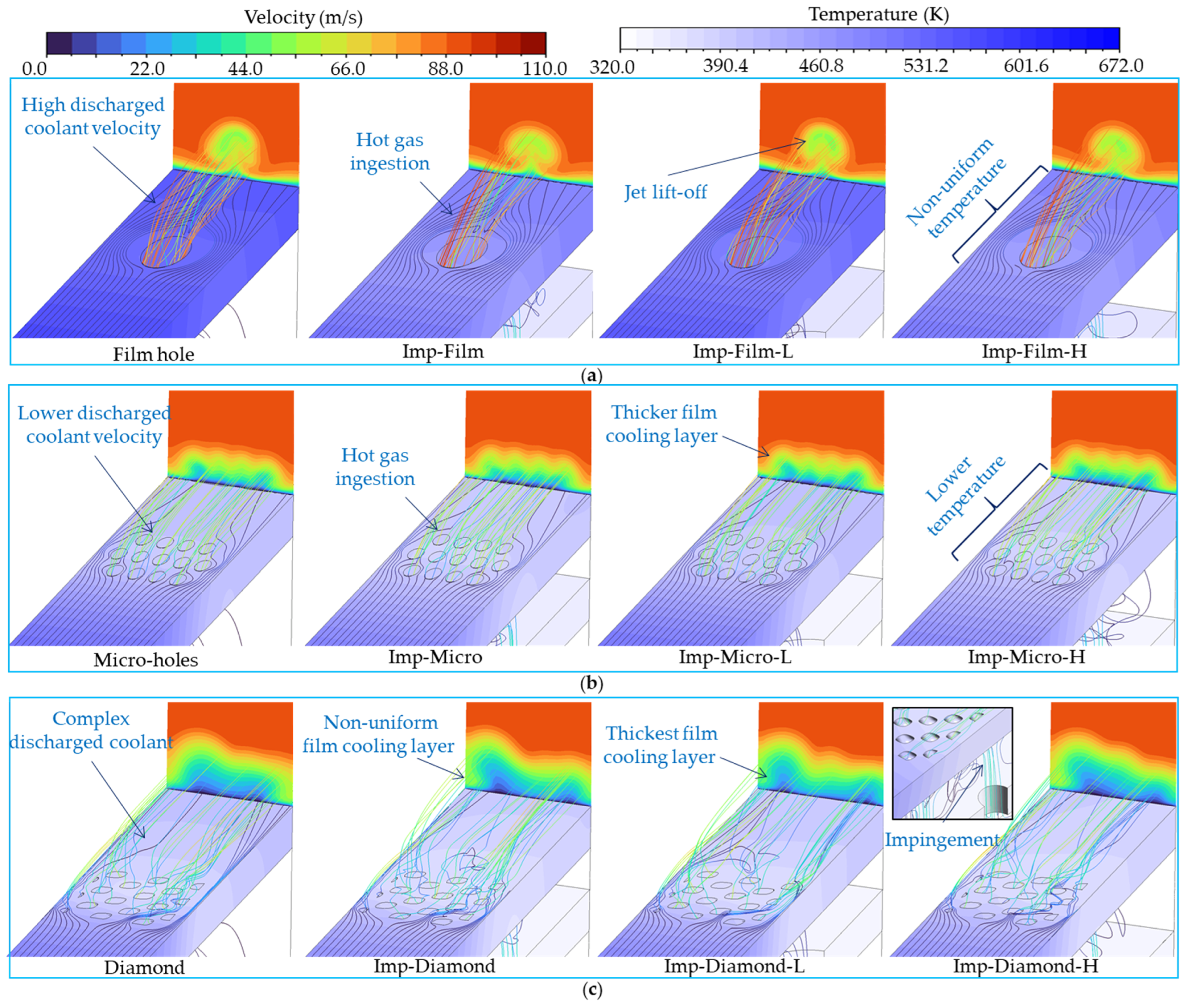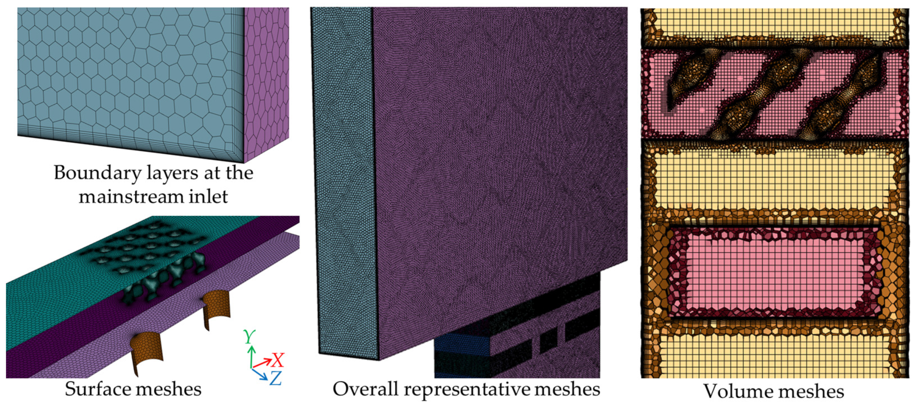 - Liu, R.; Li, H.; You, R.; Huang, Y.; Tao, Z. Conjugate Heat Transfer Study of Various Cooling Structures and Sensitivity Analysis of Overall Cooling Effectiveness. Sci. Rep. 2022, 12, 19271. [Google Scholar] [CrossRef]