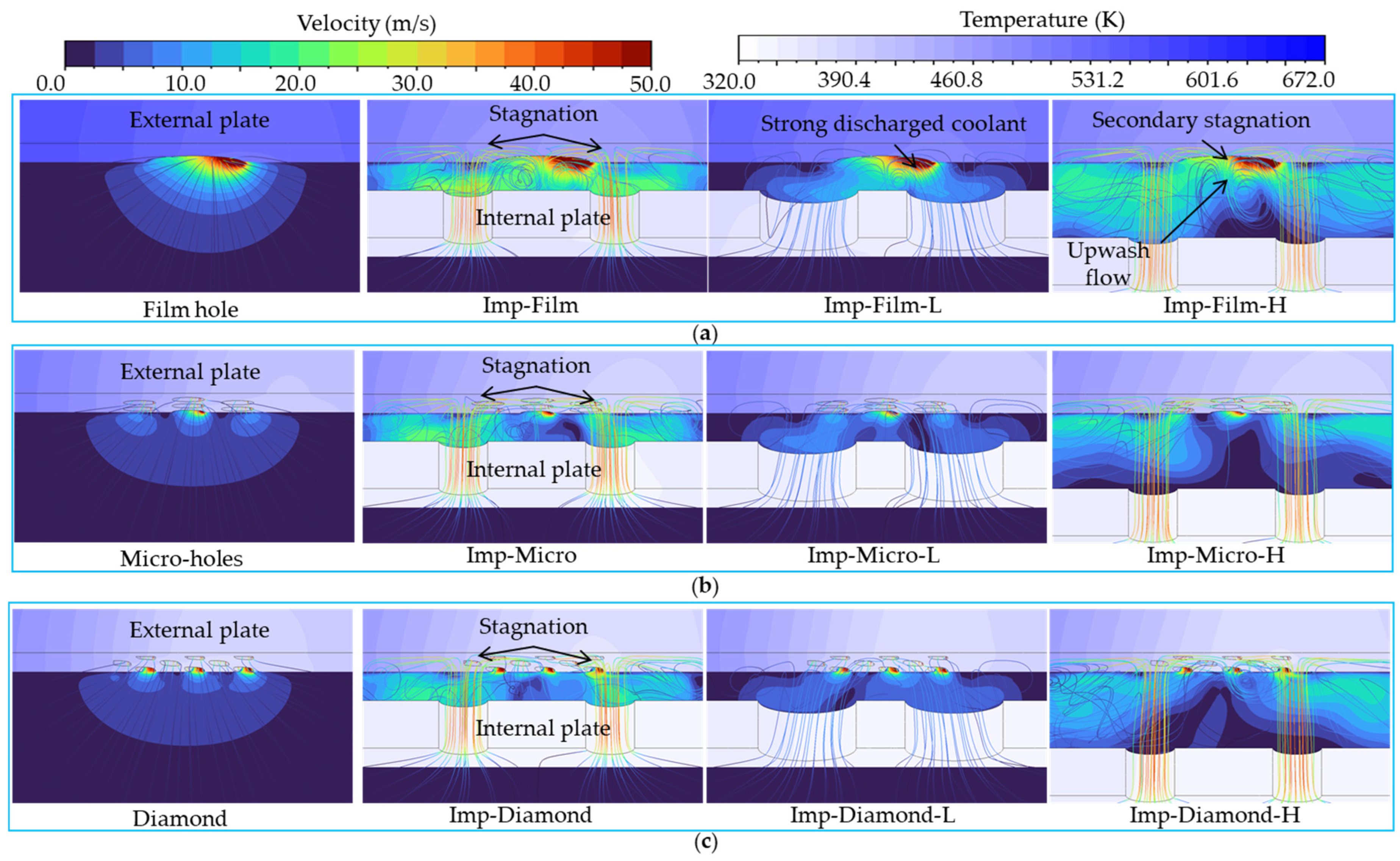 - The Diamond TPMS design generates a different flow pattern from the cylindrical film and micro-hole models. It suppresses jet lift-off and eliminates counter-rotating vortex pairs, resulting in a thicker coolant film that provides more complete coverage on the effusion plate. The Diamond structure, due to its complex internal topology, achieves higher cooling effectiveness by releasing coolant that attaches to the wall and ensuring a more uniform temperature distribution on the effusion plate.
