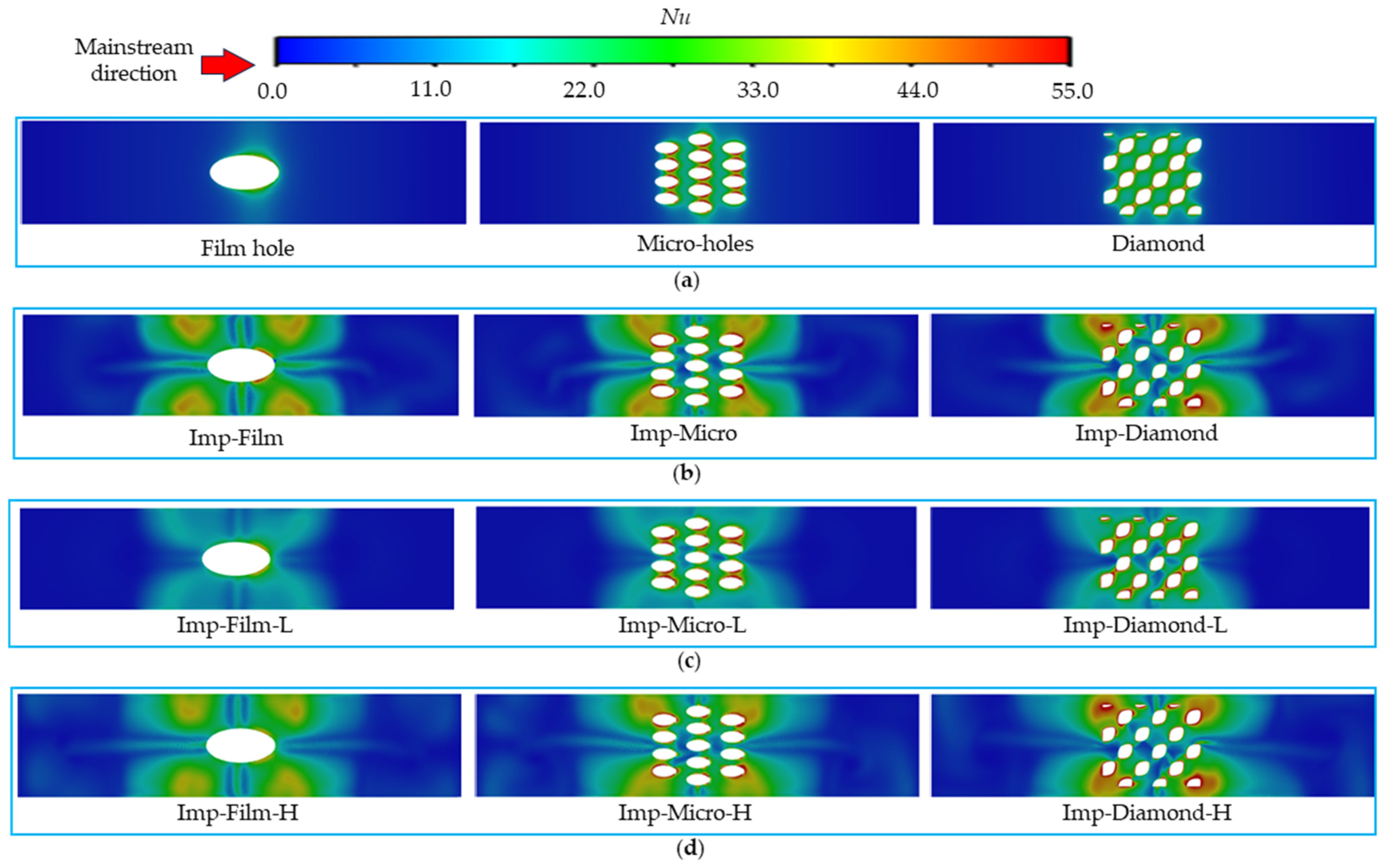 - Integrating jet impingement as a double-wall cooling system generally increases the area-averaged Nusselt number. The most beneficial impact of the jet is observed in the film hole model due to a more pronounced secondary peak in heat transfer, and this peak corresponds to the region of high heat transfer in the wall jet formed after the impingement stagnation point. For the micro-hole and Diamond models, the internal surface areas are large, allowing the jet flow to penetrate to the hole. Therefore, the jet impingement has a smaller influence on the temperature distribution of the external plate. In all designs, the jet configuration with Dj = 0.9 mm and Hj = 1.8 mm shows the highest area-averaged Nusselt number.