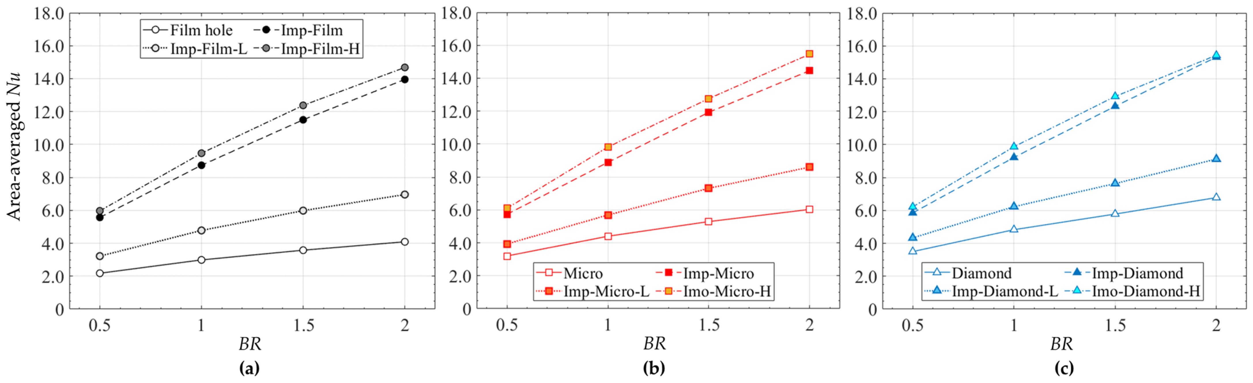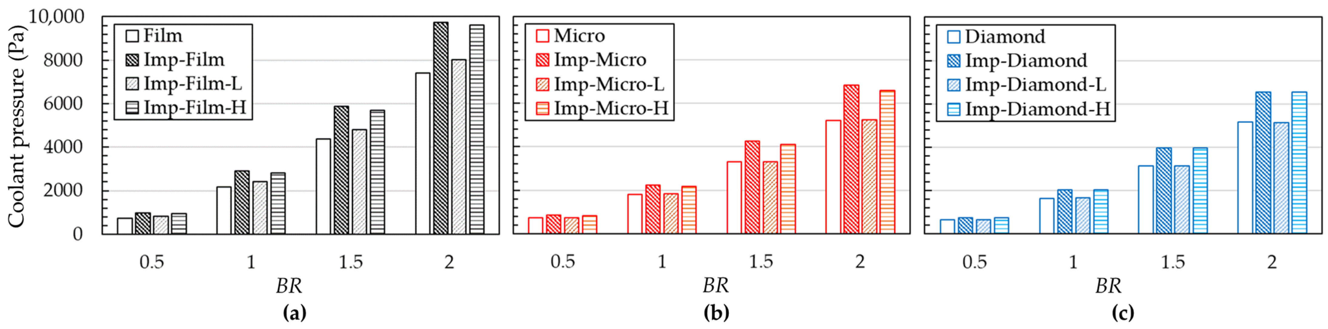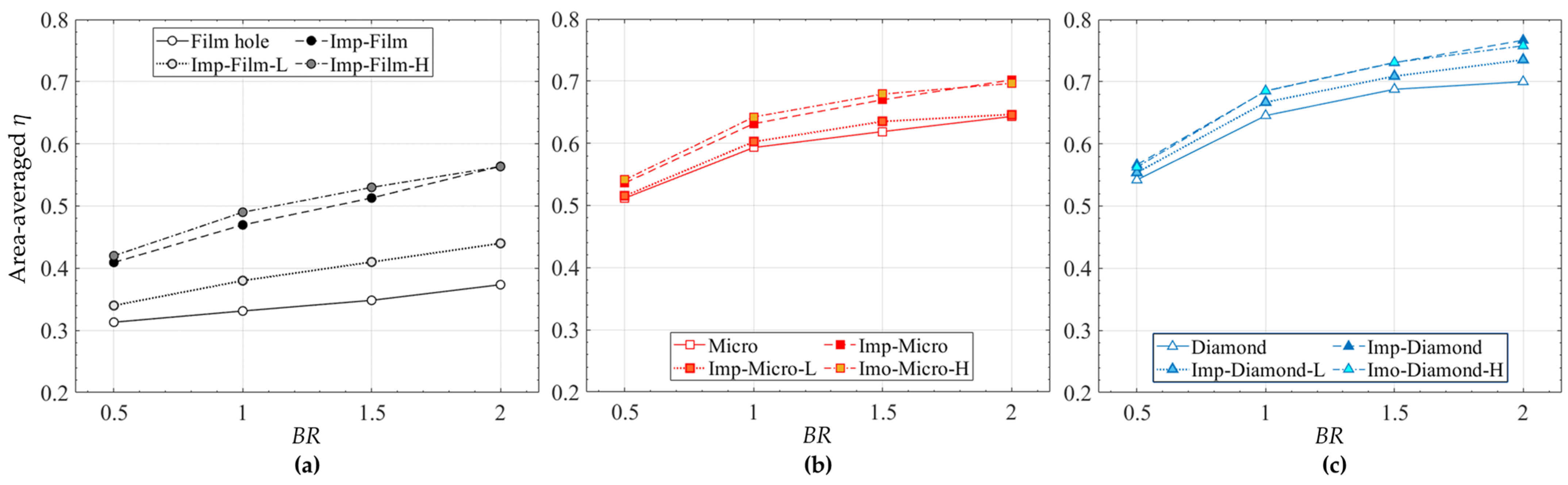 - While overall cooling effectiveness and pressure loss increase with BR for all models, the Diamond designs outperform the others. The cooling effectiveness and pressure loss are further increased when jet impingement is incorporated. At an equal total pressure loss, the Diamond with the jet impingement (Dj = 0.9 mm, Hj = 1.8 mm) provides a 101% higher cooling effectiveness than the pure film hole configuration.