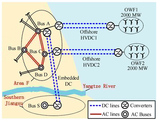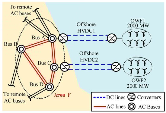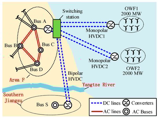 As shown in Figure 1, Area F, located along the coast in northern Jiangsu, is well-suited for offshore wind integration and plans to accommodate 4000 MW of capacity. Based on techno-economic considerations, a flexible HVDC transmission scheme has been selected for grid connection [,,]. Due to the power rating limits of DC submarine cables and converter stations, the OWF is divided into two 2000-MW segments. Each segment will be aggregated and connected to the Area F grid via a dedicated HVDC link, feeding into two 500 kV buses, which are denoted as Bus A and Bus C as shown in Figure 2.